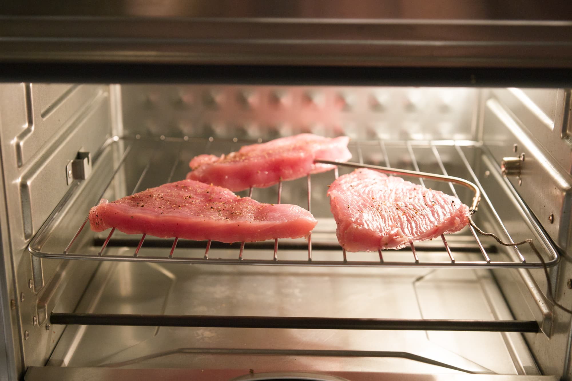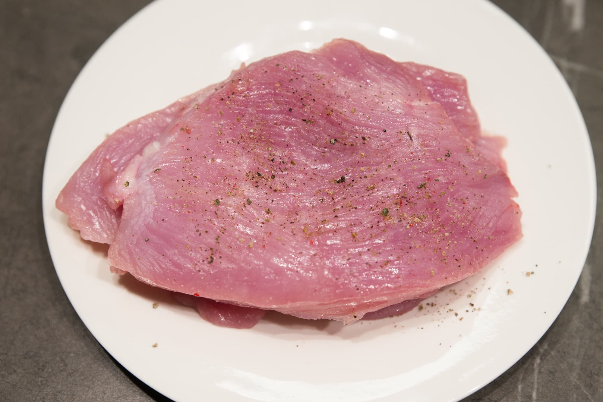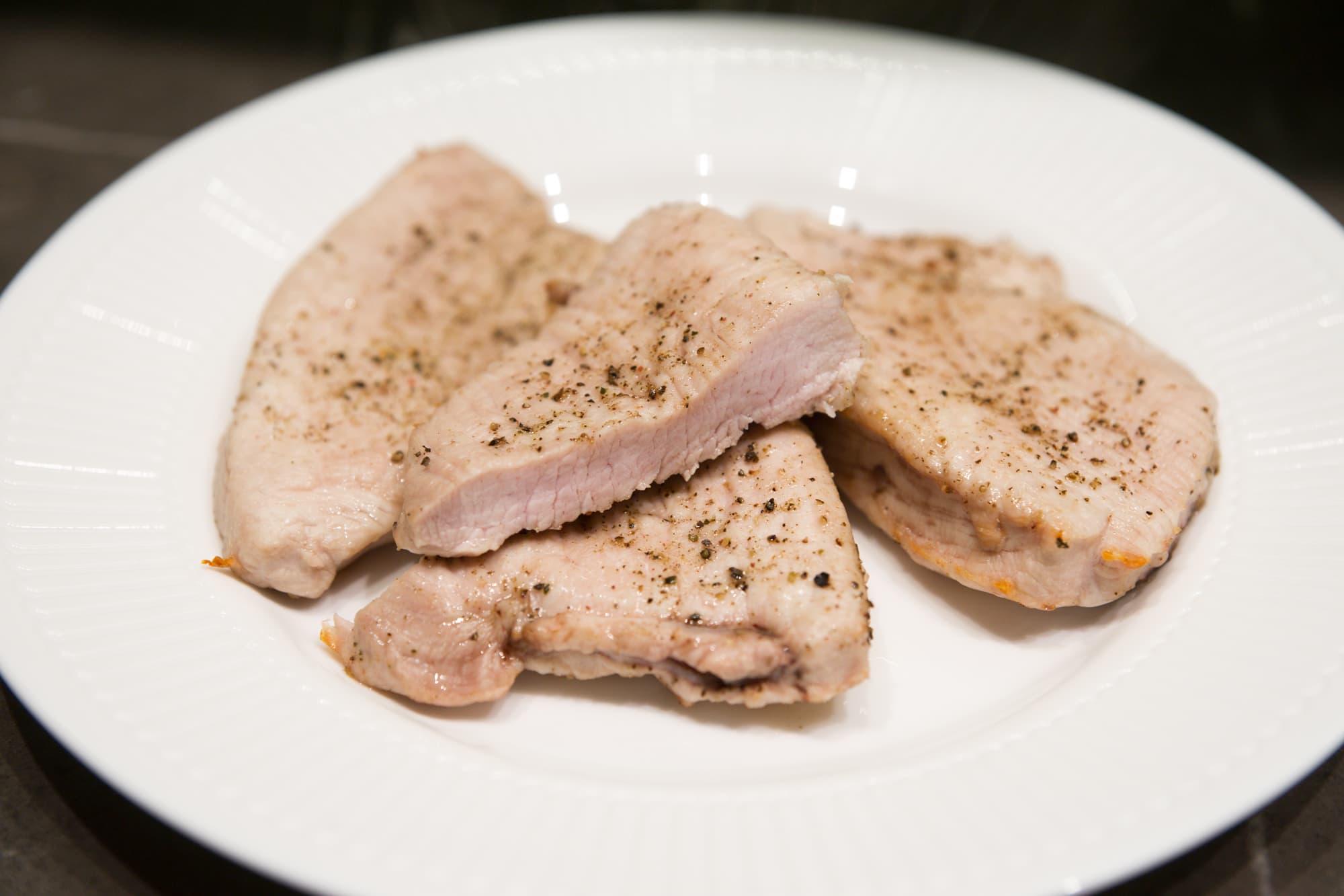 Филе грудки индейки разрезали на одинаковые по толщине куски, смазали незначительным количеством растительного масла, присыпали солью с перцем и выложили на решетку. Для контроля готовности в середину одного из кусков воткнули термощуп.