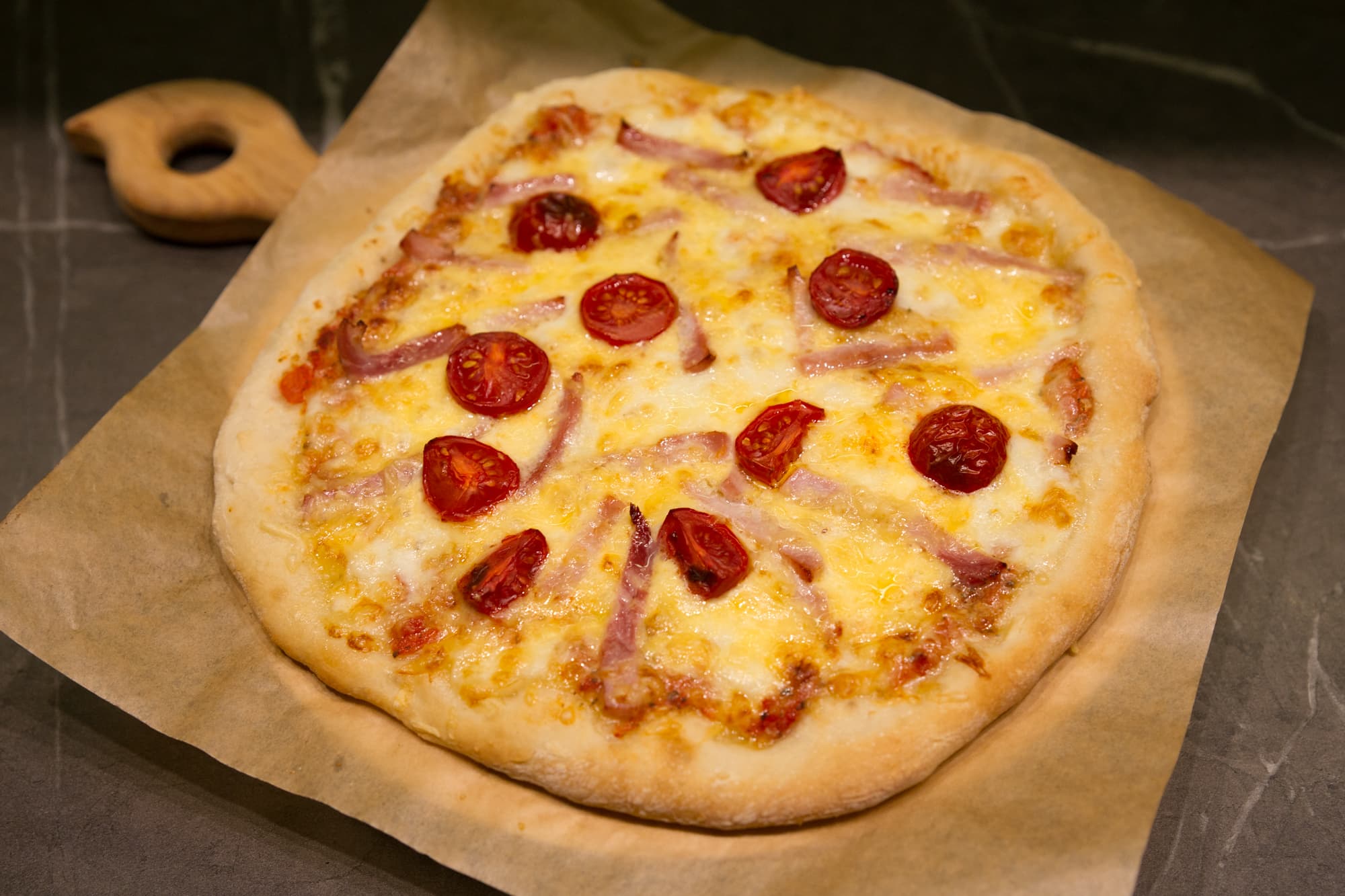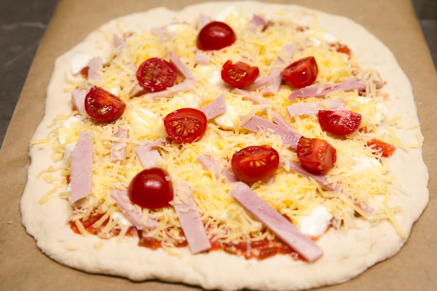 Пока шел нагрев, на бумаге для запекания размером с наш камень руками растянули тесто. Распределили по основе заранее подготовленный соус из перетертого помидора с сухими травами. Сверху разложили кусочки моцареллы, затем тертый сыр чеддер, следующими пошли ломтики сырокопченого бекона, тертый пармезан и помидоры черри.