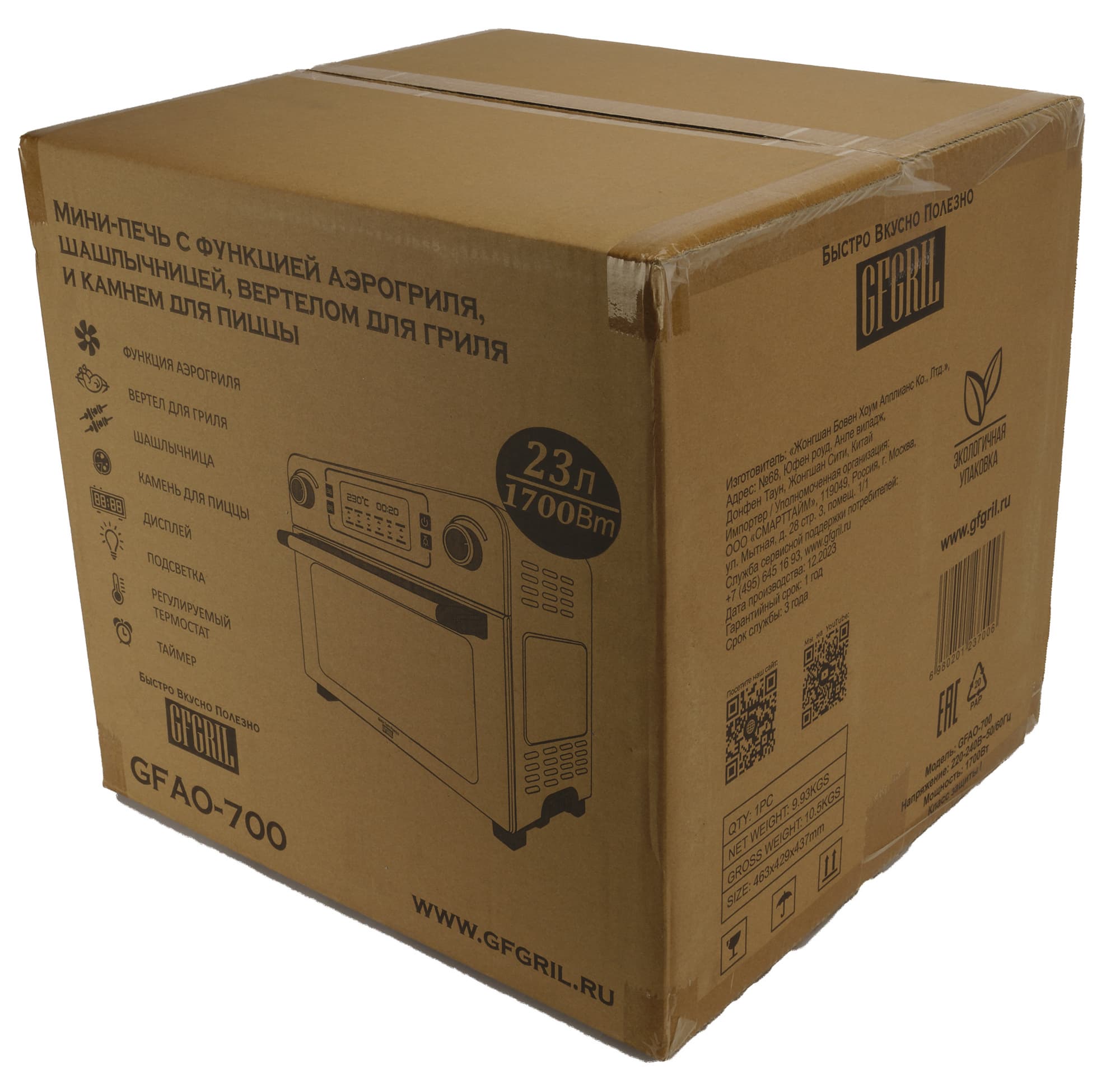 Мини-печь GFgril GFAO-700 прибыла на тестирование в картонной коробке с черно-белой печатью. На лицевой стороне упаковки размещены схематическое изображение самого прибора, имя бренда и модели, а также перечислен ряд ее ключевых особенностей. На боковых стенках — информация о производителе, краткие технические характеристики и QR-коды, ведущие на официальный сайт компании.