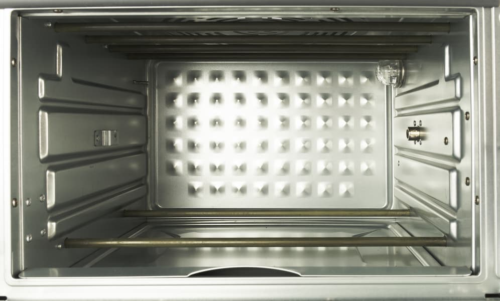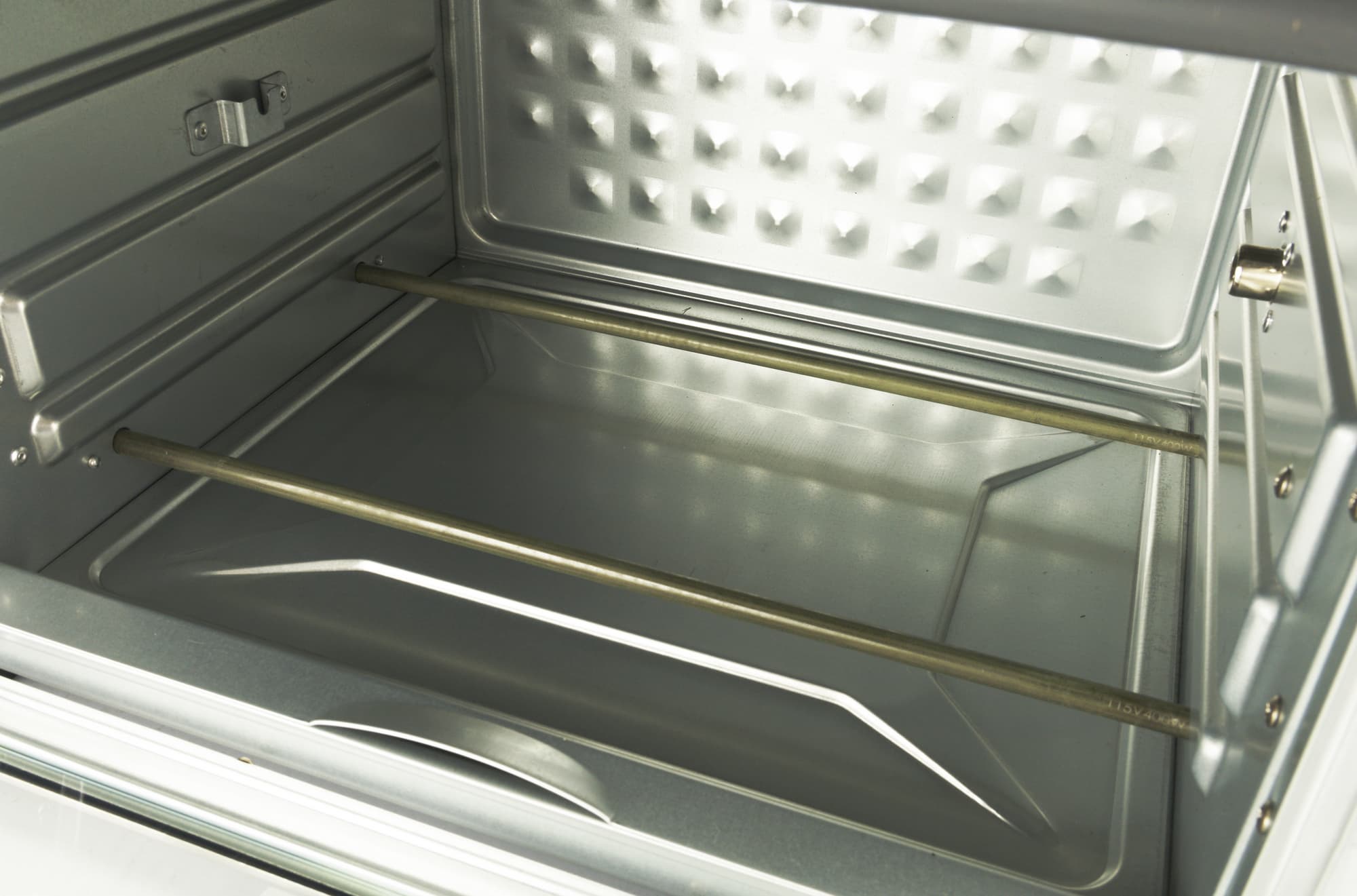 На боковых стенках камеры, покрытой металлом мы видим направляющие для размещения противня или решетки на одном из трех уровней. Сверху и снизу расположены открытые тонкие тэны.