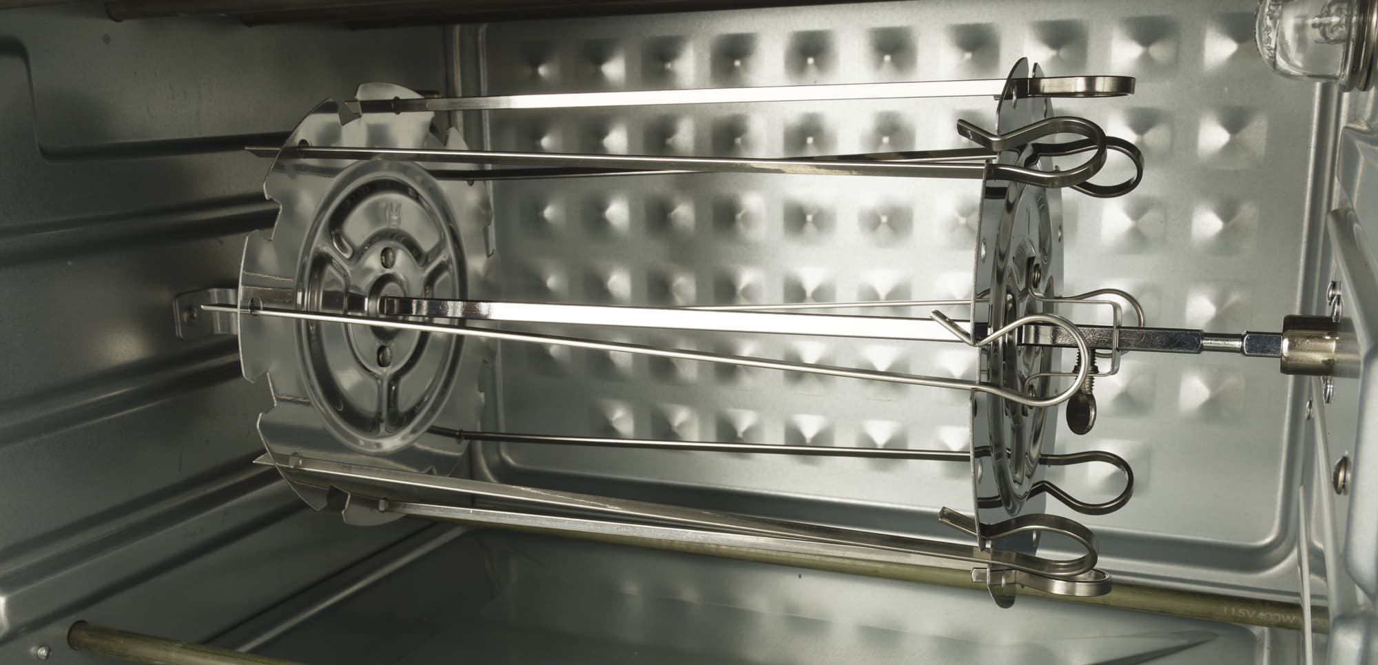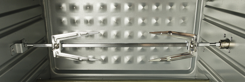 По центру боковых стенок — отверстия для установки вертела. В верхнем дальнем углу справа размещена лампа.
