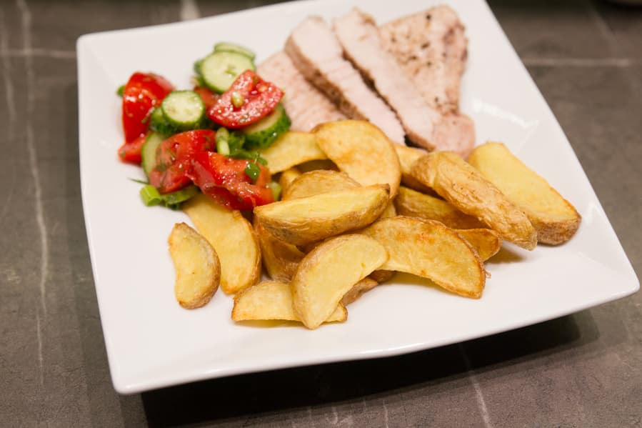 Уже через 10 минут картофель был готов — хрустящий и мягкий внутри, с золотистой корочкой.