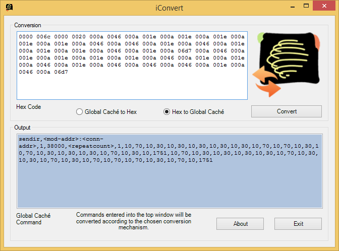 Для получения необходимых для передачи пакета данных есть несколько способов — использование готовой базы кодов, что применяется в некоторых системах автоматизации, конвертация кодов из формата HEX в оригинальной утилите iConvert или обучение через встроенный ИК-приемник (или внешний в случае серии GC-100) с использованием программы iLearn.