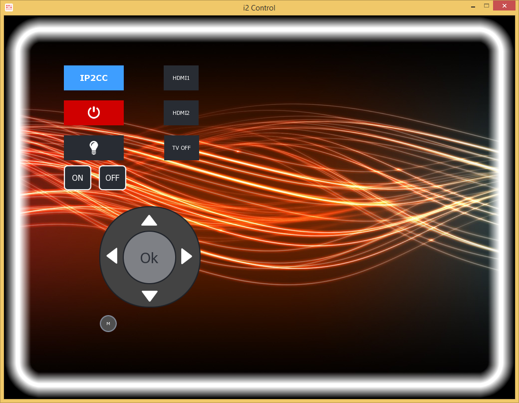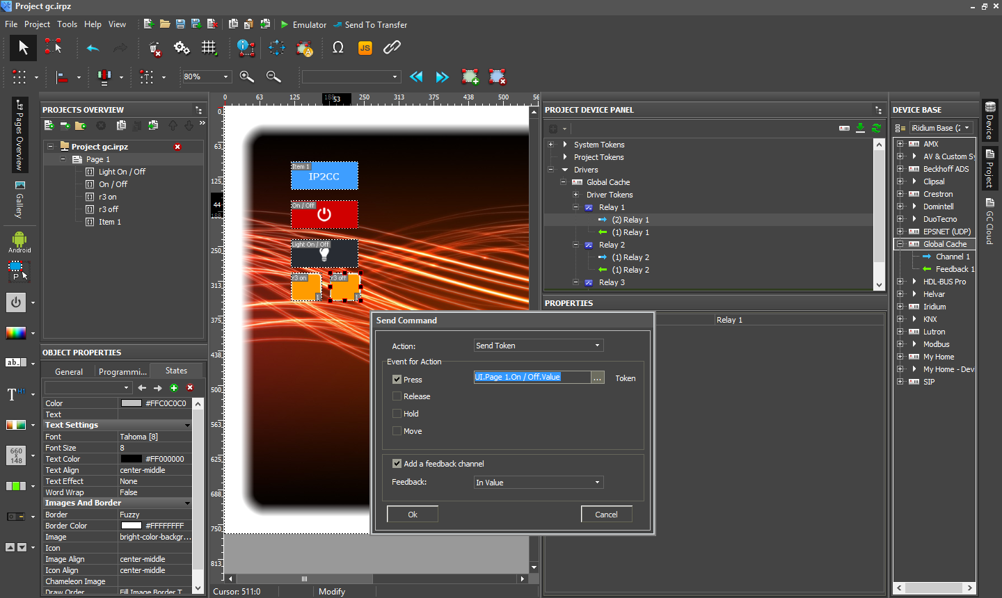 В качестве примера мы создали интерфейс с двумя переключателями для трех каналов IP2CC и несколькими кнопками для управления техникой через ИК и последовательный порт. Заметим, что здесь можно использовать и обратную связь, что может быть полезно, например, для контроля состояния выходов реле и изменения внешнего вида кнопок. Обратите внимание, что конкретные ИК-команды доступны во встроенной базе данных и достаточно использовать простое перетаскивание мышкой для их использования. И конечно можно назначить одной кнопке интерфейса не просто одну команду, а целый скрипт, например, для включения домашнего кинотеатра для режима просмотра видео с медиаплеера.