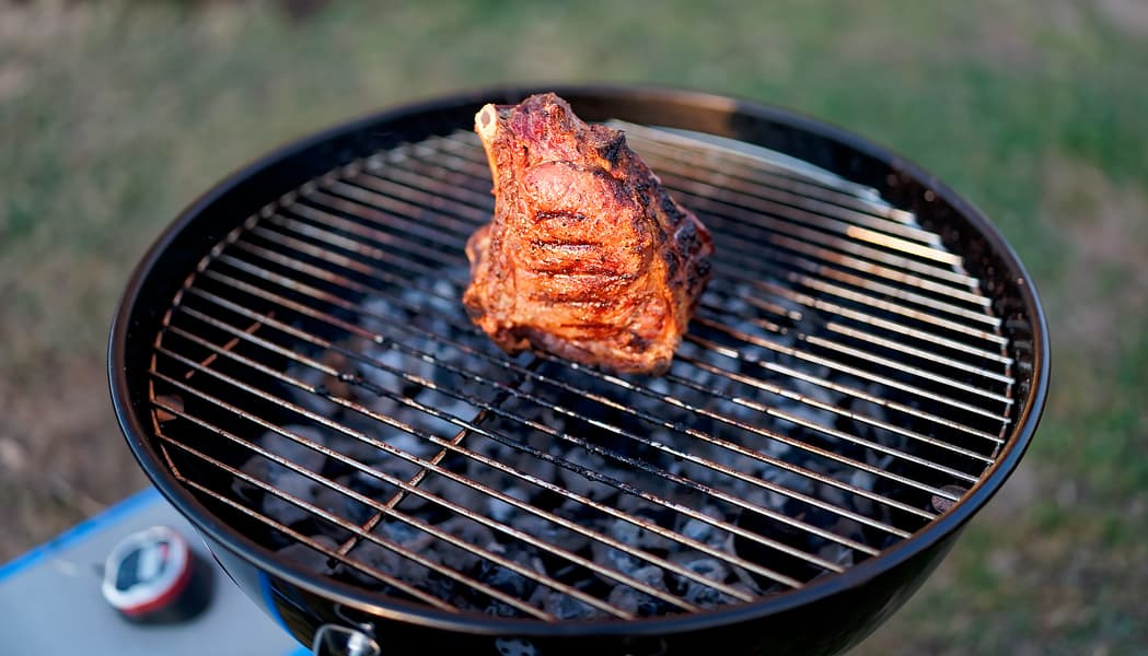 Затем воткнули в центр щуп от термометра (наш достался нам от компании Weber, и мы на него не нарадуемся), установили показатель «Ростбиф на кости. Медиум» и поместили в гриль под крышку.