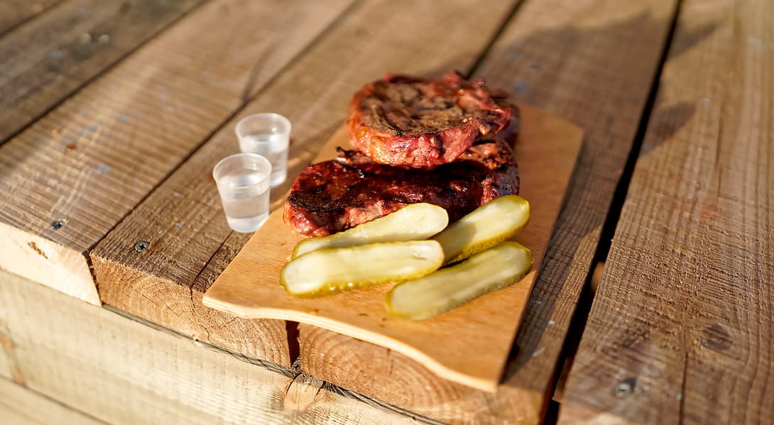 Мы готовили блюда в основном на прямом жаре, то есть на решетке над углями. Периодически разгребая угли по краям и закрывая гриль крышкой, получали барбекю-духовку. Никаких современных «наворотов» вроде разделителей, жароотсекателей, камней для пиццы и прочего мы не использовали. Забегая вперед — работа с «базой» начинающего гриль-специалиста оказалась интересной и мы не заскучали, а результат вышел более чем достойным.