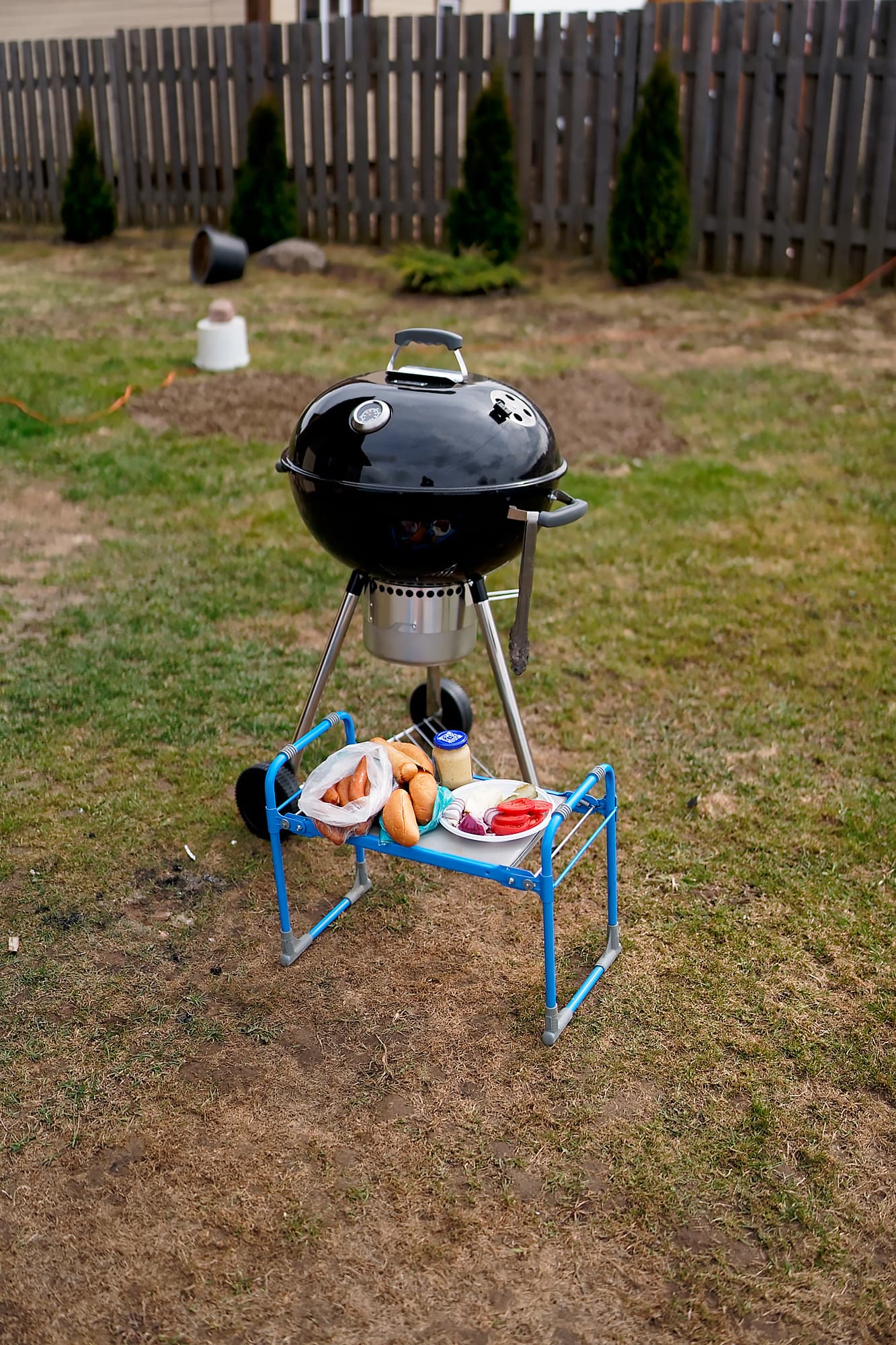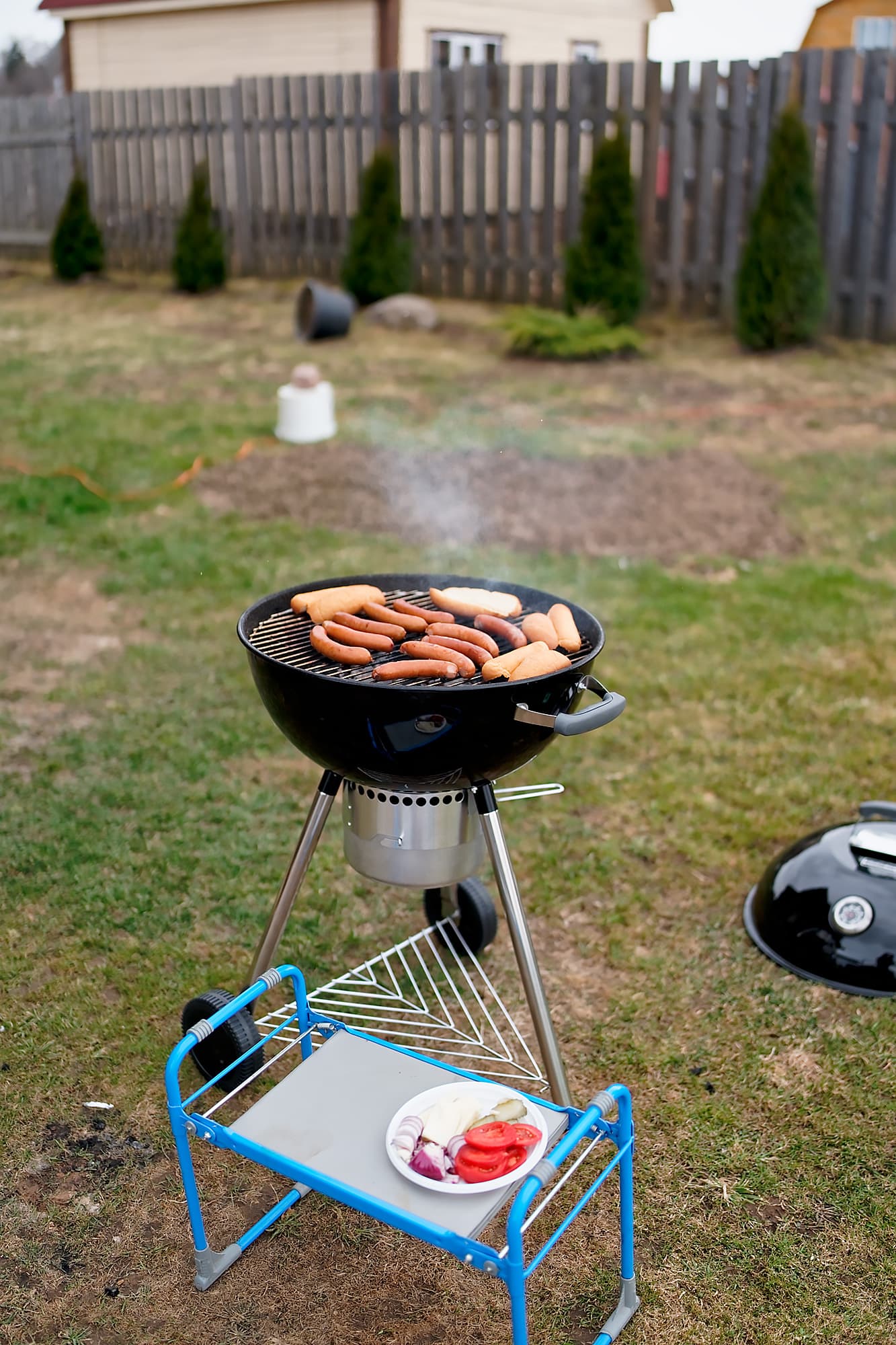 На этот момент стало ясно, что столик или раскладные полочки нашему грилю очень бы не помешали, но в целом процесс идет без проблем — чем крыльцо не столик?