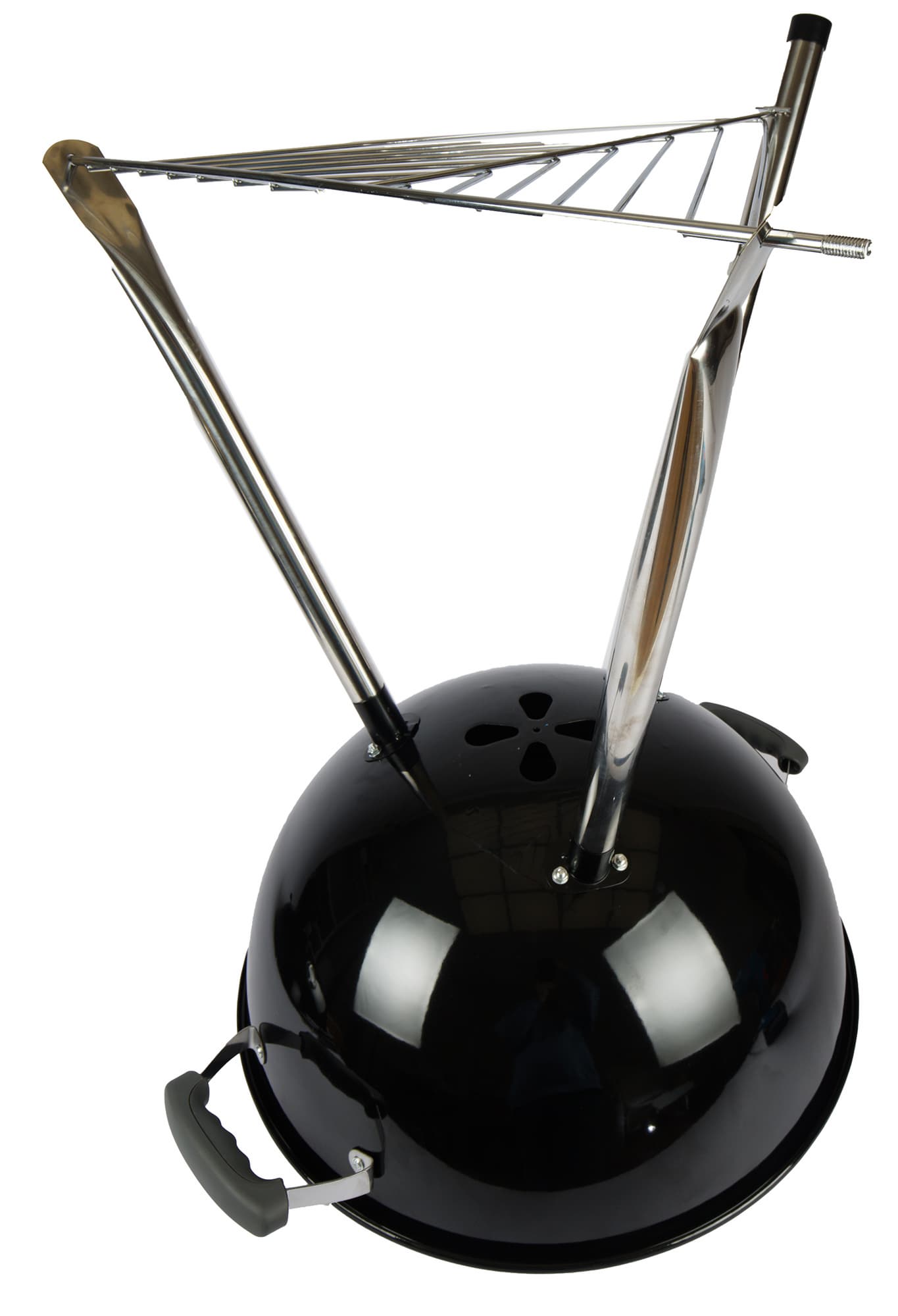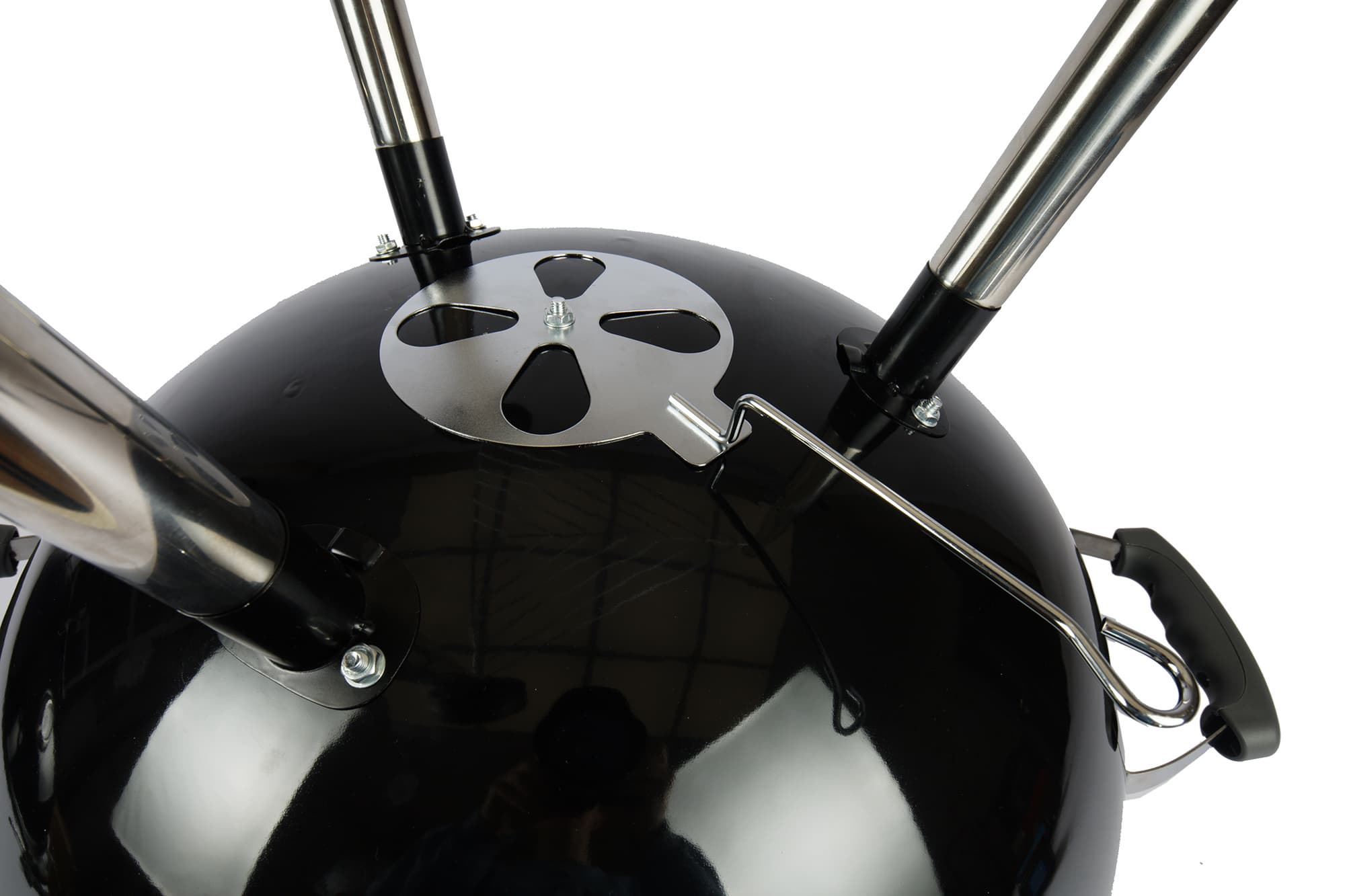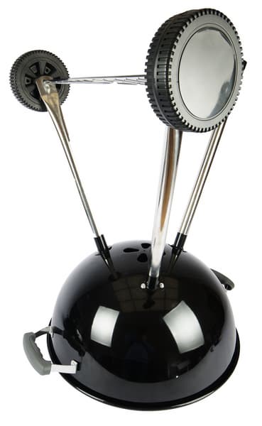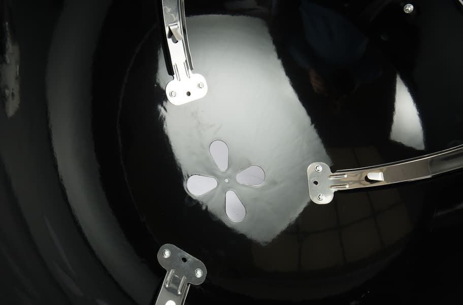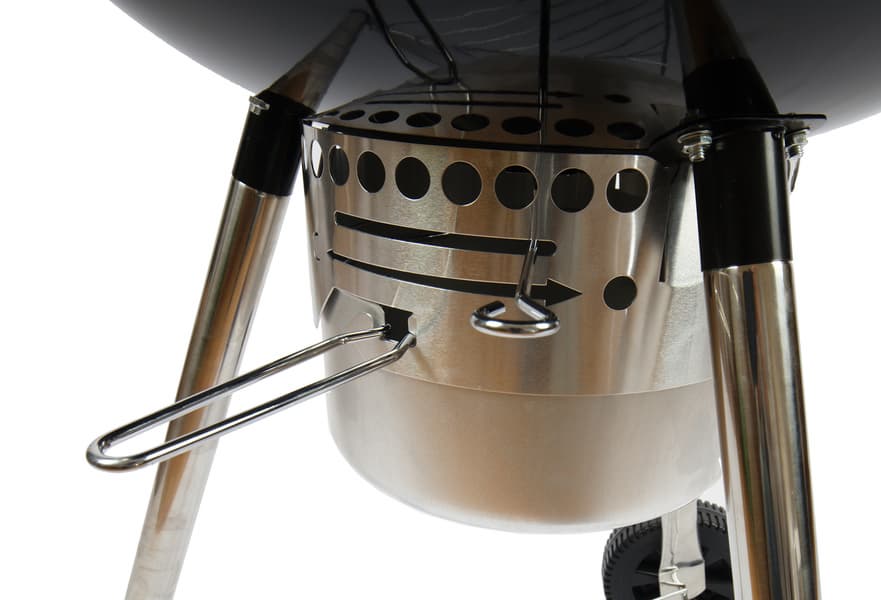 Если сравнивать напрямую с веберовской продукцией, то везде немножко «труба пониже и дым пожиже»: прутья у решеток потоньше, зольник и кронштейн, в который он вставляется, менее монументальны, полушария выполнены из примерно 1,5-мм стали (мы посчитали, что до 2 мм толщина дошла за счет эмали). Нижняя заслонка представляет собой просто увеличенную копию верхней, а не три здоровенных лепестка, выполняющих к тому же роль сгребателей золы, как у Master-Touch.