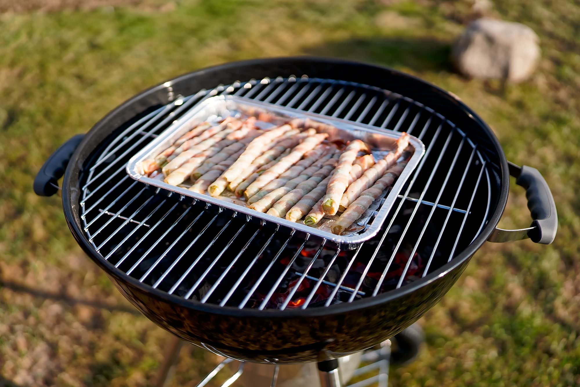 Побеги зеленой спаржи обмотали полосками бекона и поместили в фольгированный поддон для гриля.