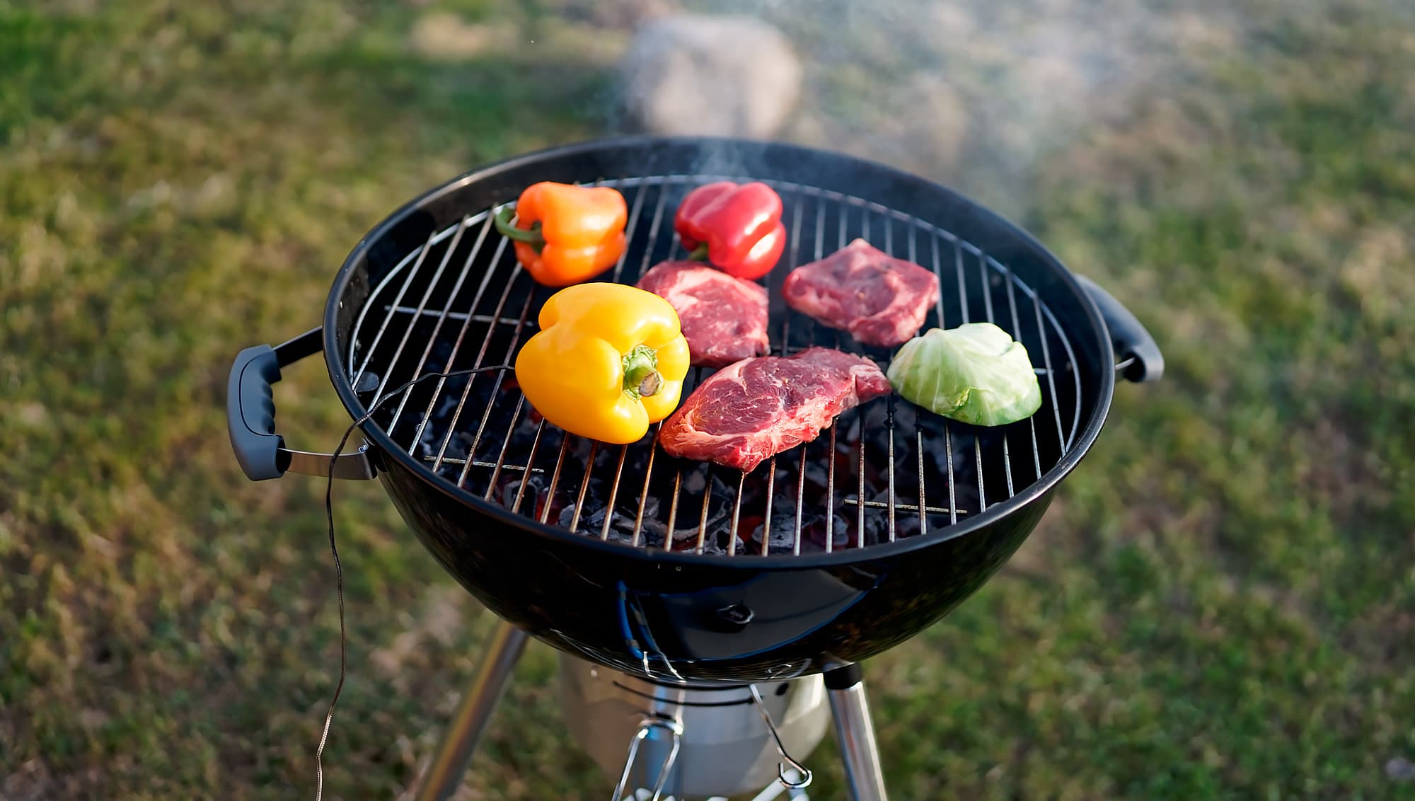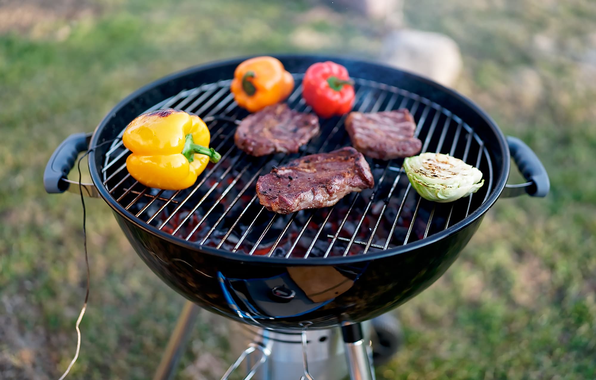 Решетка нашего GoGarden Premium 56 велика. Стейки из прошлого теста весили по полкило каждый — и все равно места на решетке осталось достаточно. Так что мы запекли три огромных перца: стейки уже сняли, а перцы обугливали до почернения кожицы.