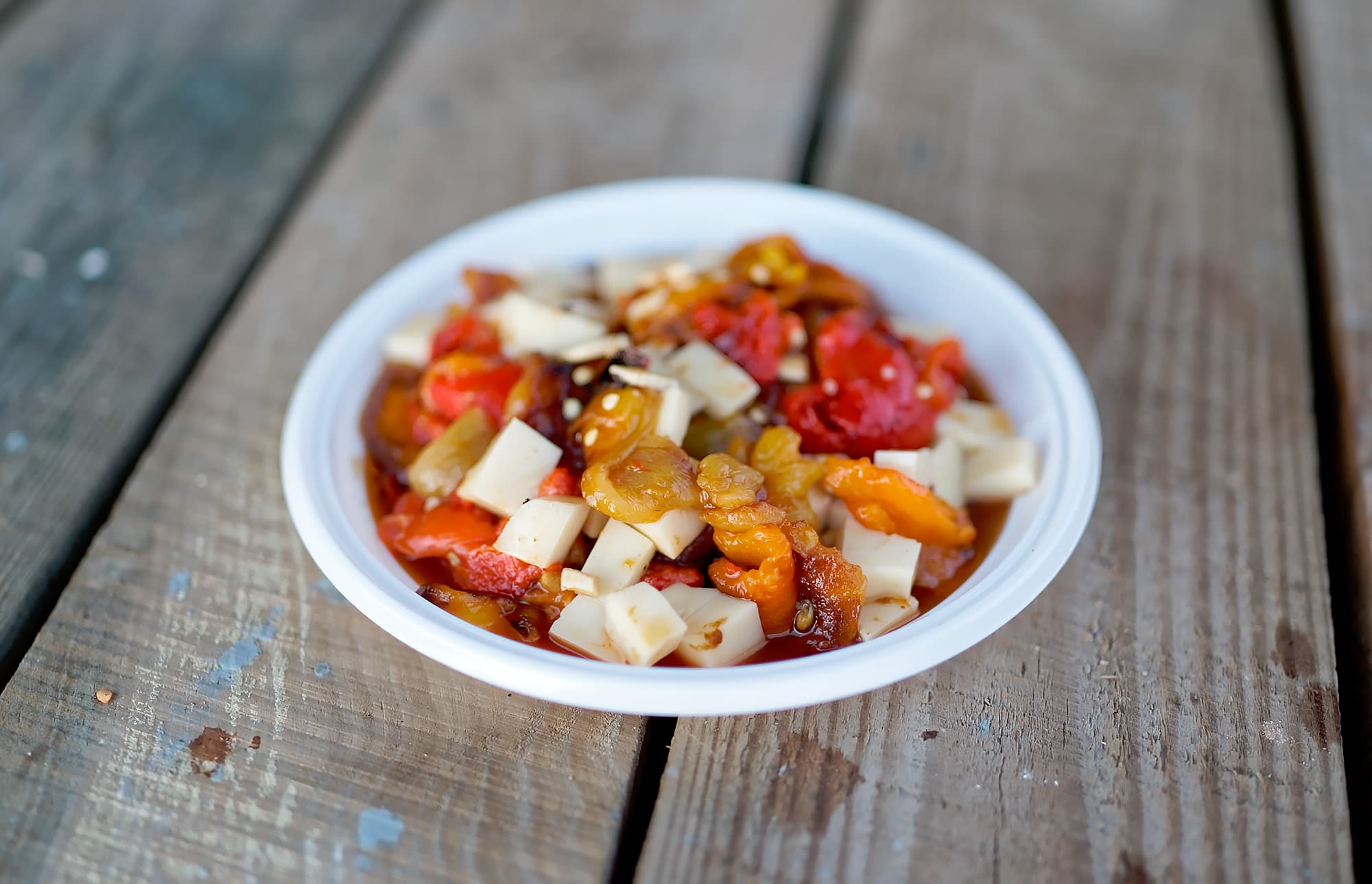 Обугленные перцы положили горячими в герметично закрывающуюся пластиковую емкость и дали им «вспотеть» от образовавшегося конденсата. Так от них легко отстала кожица. Серединки выкинули, а сок сохранили, мякоть нарвали на крупные куски, добавили нарезанный кубиками козий сыр и три порезанных мелко зубчика чеснока и щепотку соли.