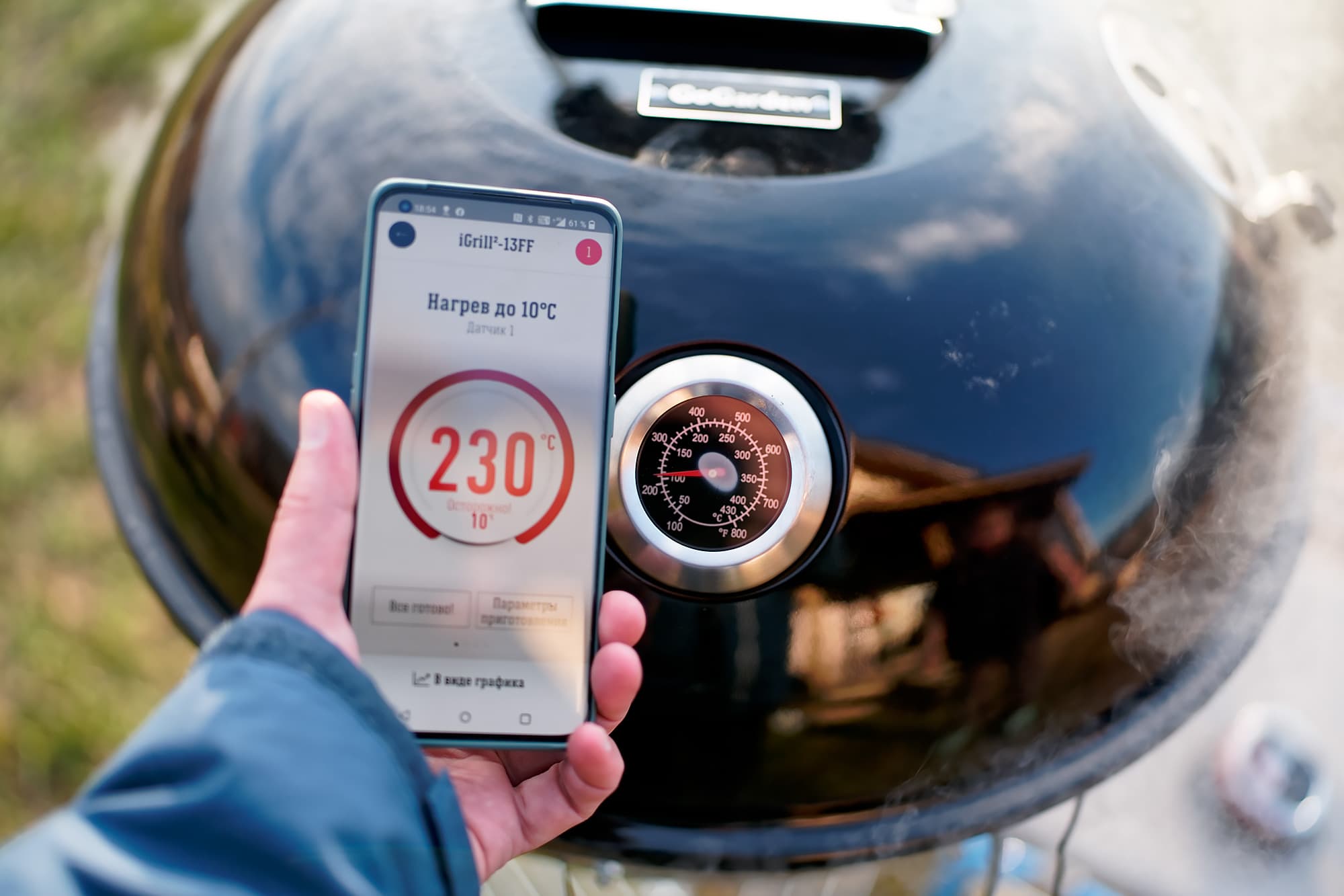 Встроенный термометр поначалу врал совершенно безбожно, что видно на фото ниже. На экране смартфона — показания датчика iGrill, лежащего на решетке. Понятно, что решетка ближе к углям, но такую разницу это объяснять не может.