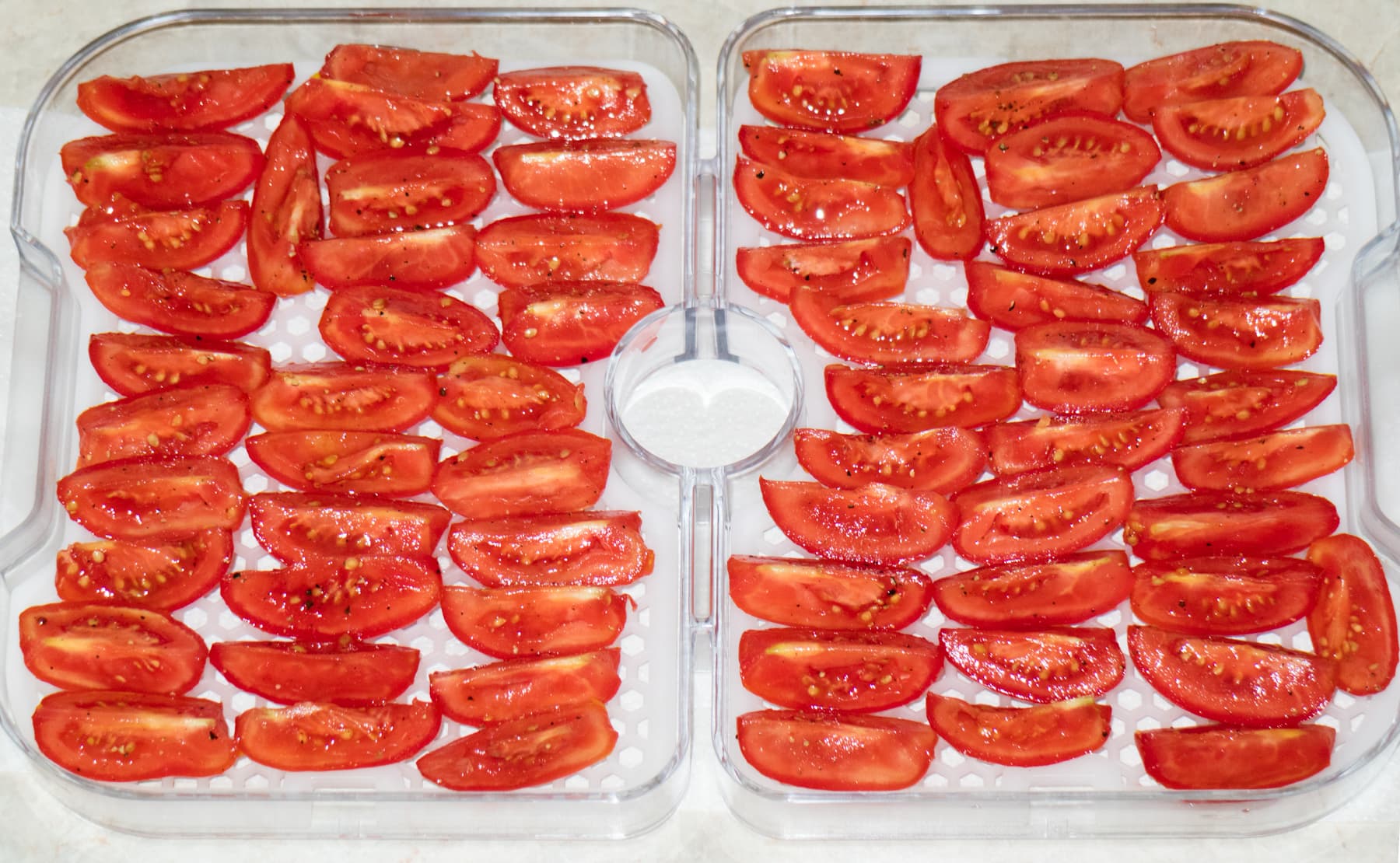 Томаты сорта сливки нарезали на 4 части, посолили, поперчили, посыпали сахаром и отставили в сторону на пару часов для выхода излишней влаги, чтобы не залить выделяющимся в начале сушки соком внутреннюю часть дегидратора. Смазывать ломтики растительным маслом, как мы это обычно делаем при вялении томатов, не стали по той же причине — чтобы не мучиться затем с мытьем основания. Разложили ломтики помидоров на поддон так, чтобы они лежали не внахлест и не касались друг друга. На одном лотке (двух поддонах) разместилось 685 г томатов.