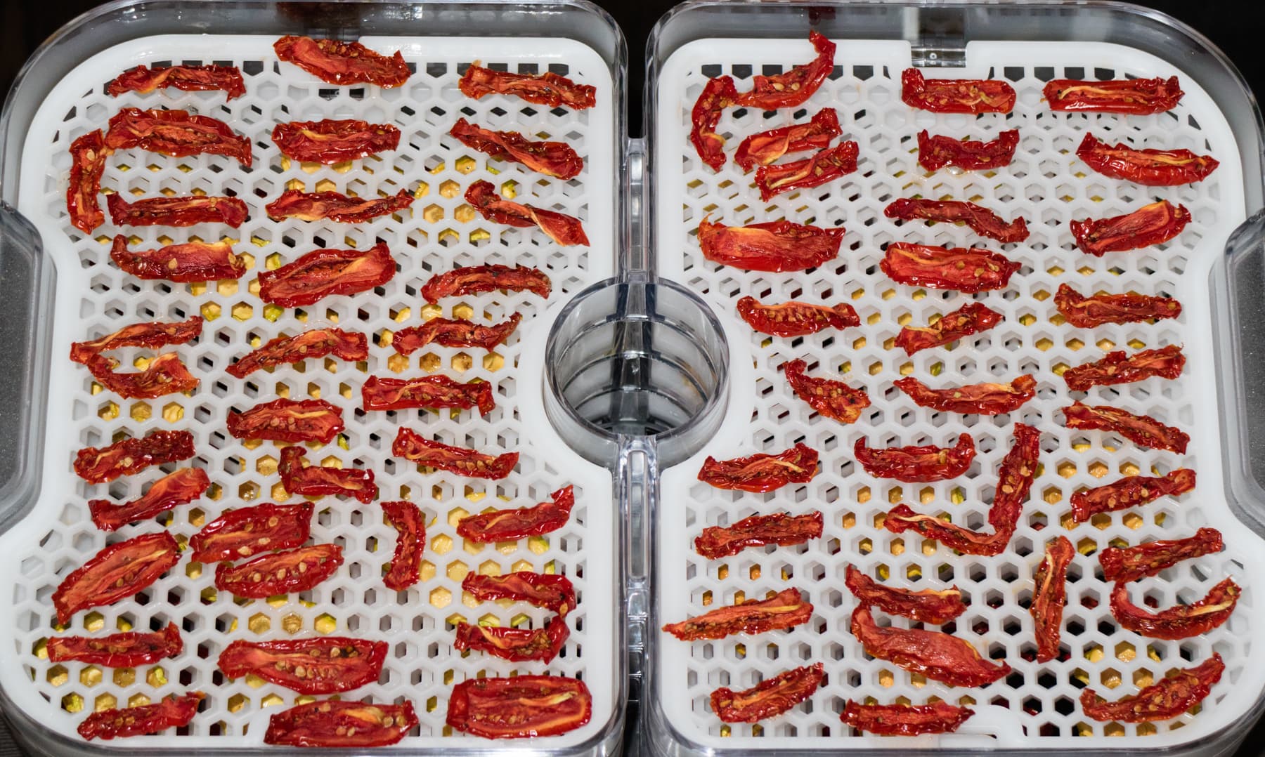 К этому времени мы уже привыкли к особенностям сушки в Gochu D-310 и потому спокойно перемещали лотки вверх-вниз, выискивали пересушенные и недосушенные кусочки томатов и меняли их месторасположение на поддоне.