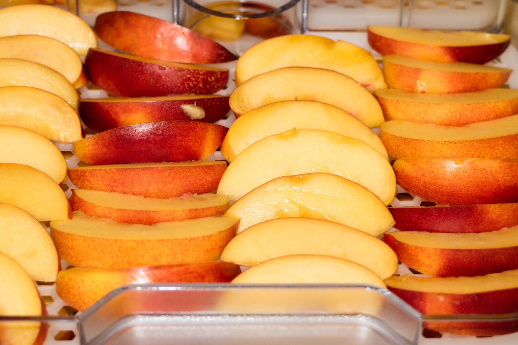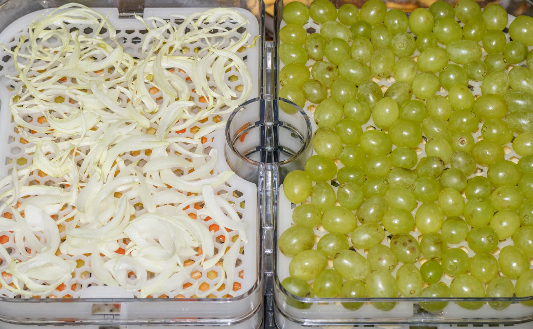 Другую камеру дегидратора мы заполнили фруктами: бананами, нарезанными на слайсы, яблоками, очищенными от кожуры и семечек, нектаринами и виноградом. Все фрукты были выложены в один слой.