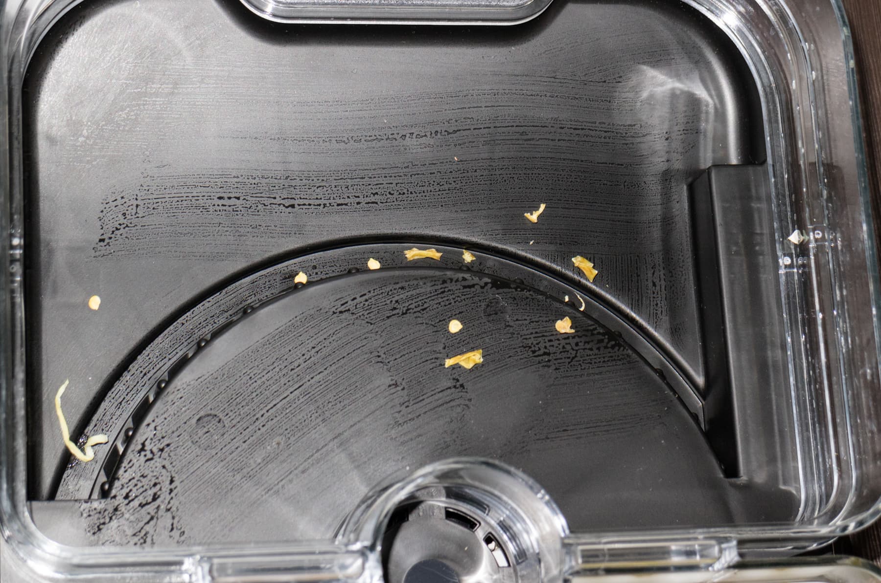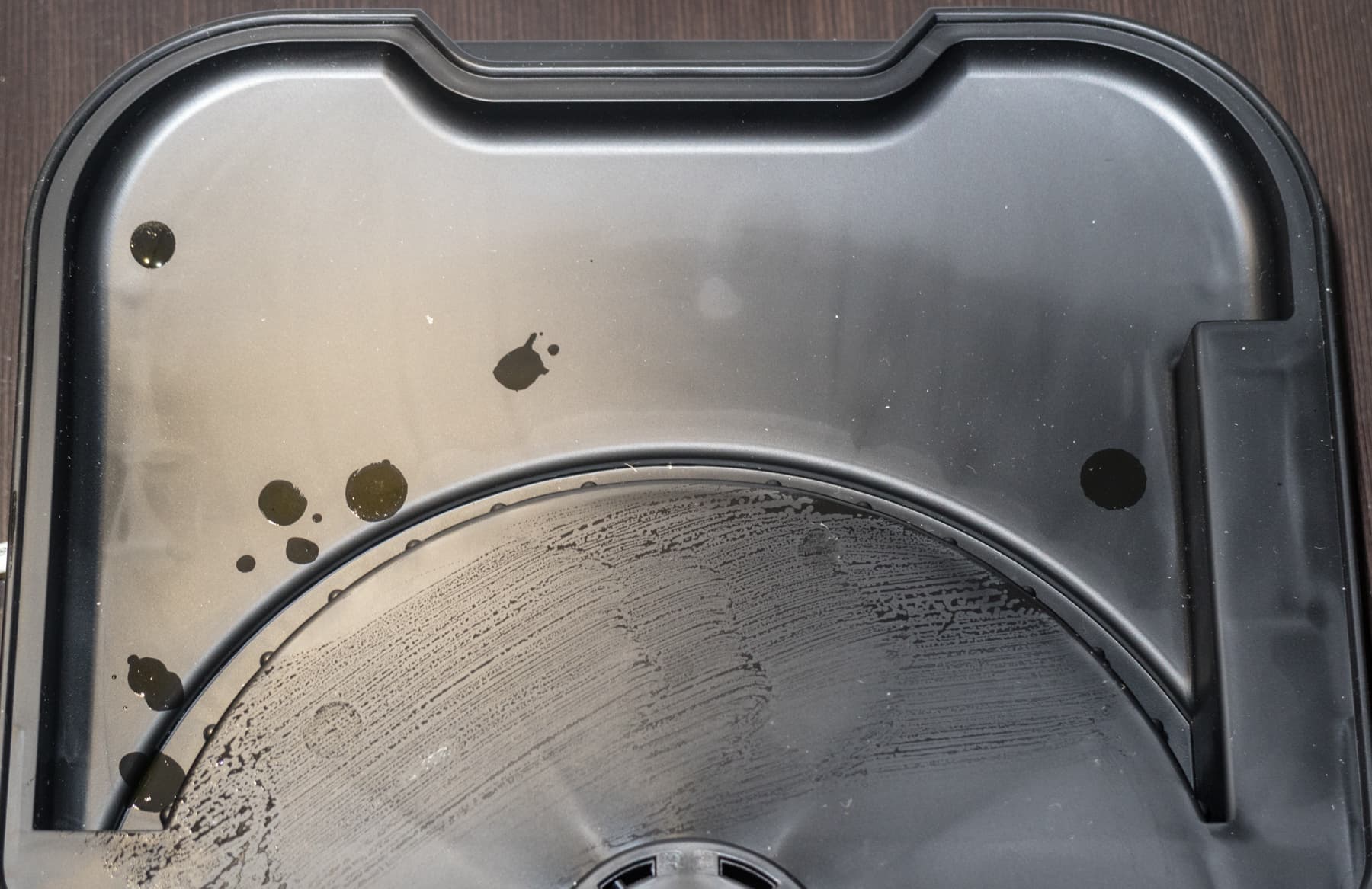 Пару слов следует сказать про очистку внутренней части основного блока. Из-за отсутствия защитного поддона при сушке мелких кусочков или сочного сырья остатки продуктов или капли влаги попадают на поверхность корпуса. Мы столкнулись с такой проблемой при изготовлении вяленых томатов. По завершении сушки основание выглядело вот так: