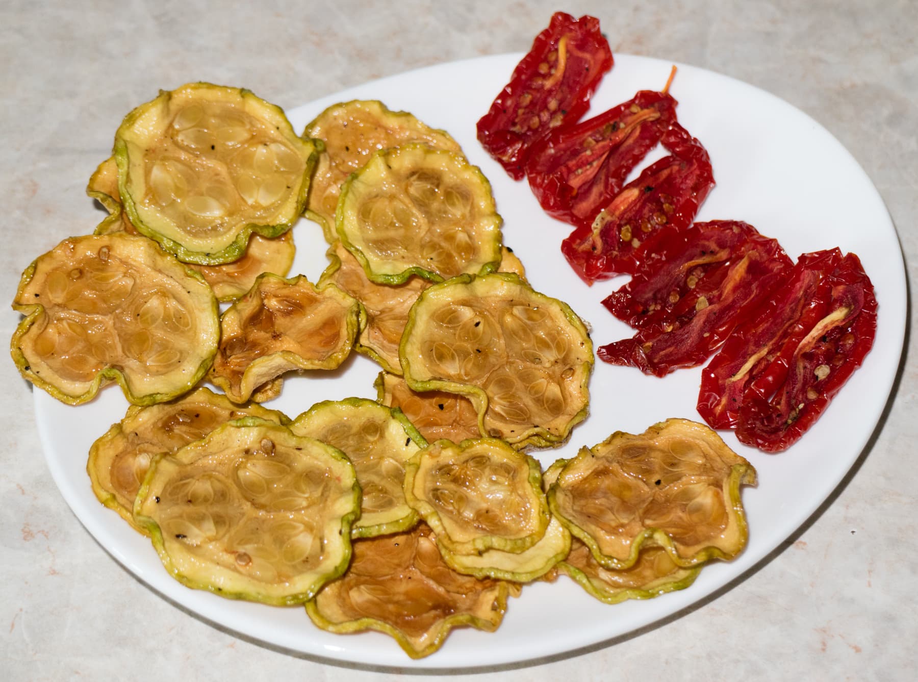 Из кабачков же получились забавные по вкусу снеки. Мягкие, гибкие, с приятно тягучей структурой, их можно есть как в чистом виде, так и на бутерброде. Любопытный опыт. Вряд ли мы будем такое повторять, но вегетарианцам вяленые кабачки могут прийтись к столу.