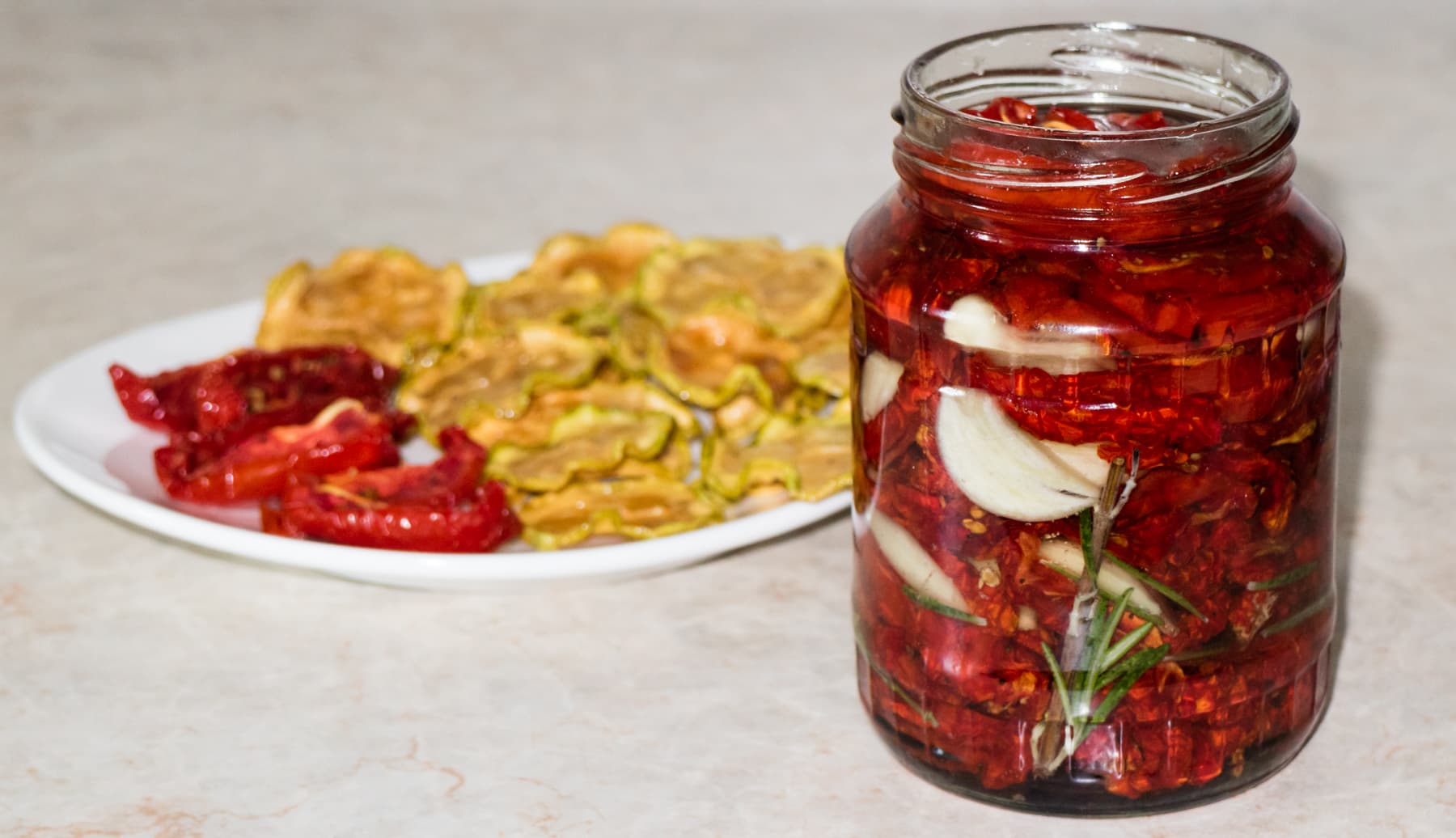 По завершении сушки дождались, пока томаты остынут, и сложили кусочки в баночки, перекладывая розмарином и нарезанным свежим чесноком. Залили маслом и убрали в холодильник. Готово блюдо будет лишь через две-три недели, когда помидоры напитаются маслом, ароматом чеснока и пряной травы.