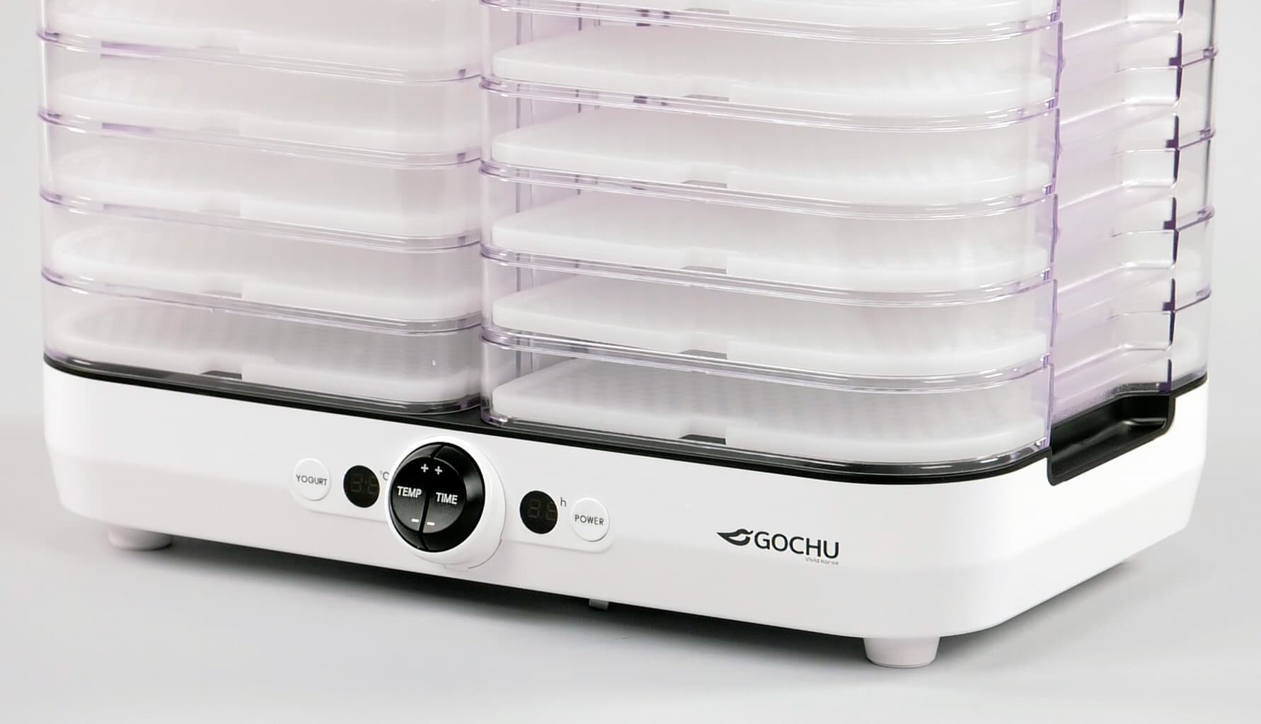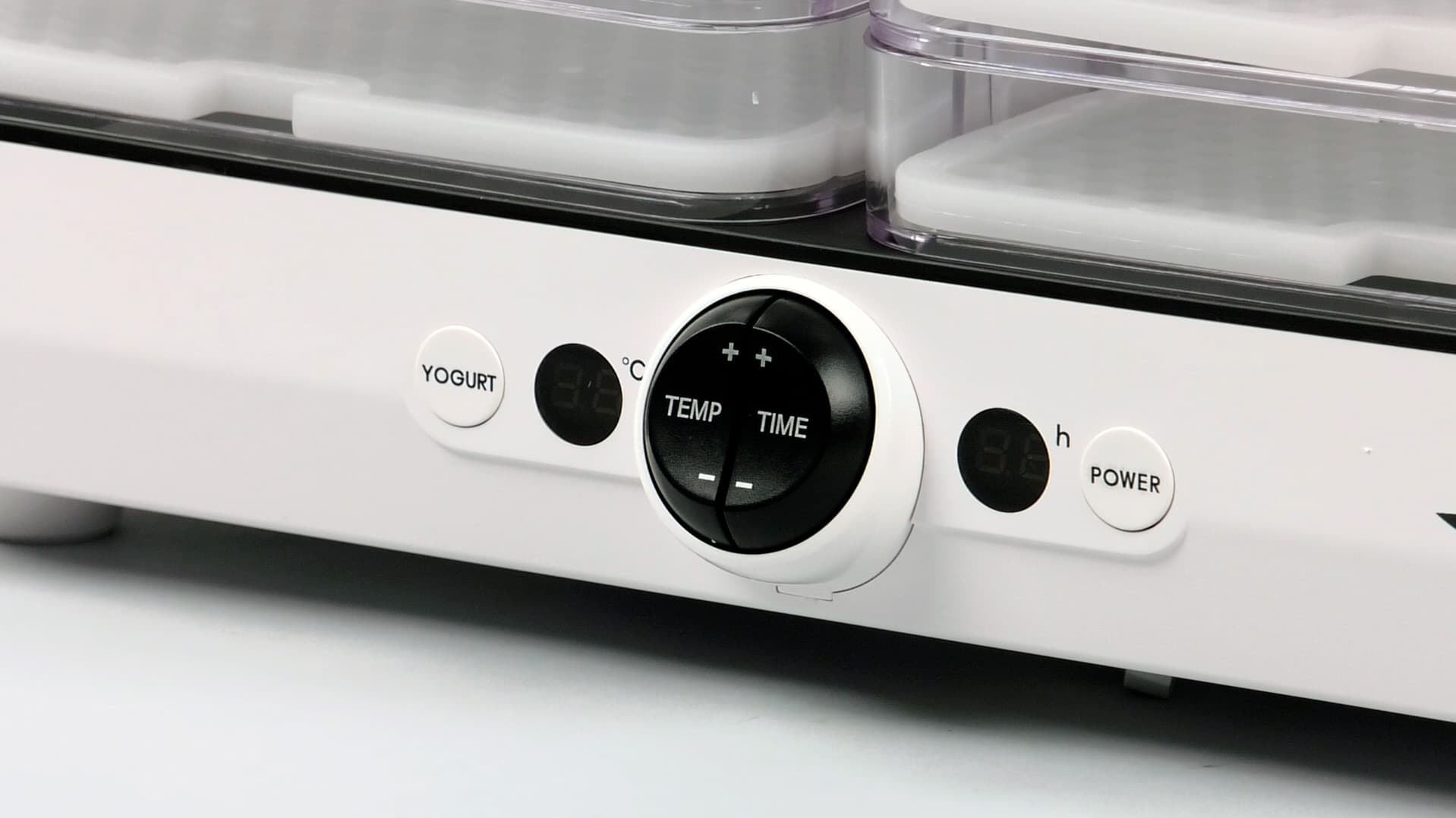Панель управления находится на передней стороне основания. По центру расположены клавиши установки температуры и времени. При надавливании вверх можно увеличить показатели, при нажатии вниз, соответственно, уменьшить. По обеим сторонам от клавиш видны округлые дисплеи: слева — температуры, справа — времени. Крайняя справа кнопка включения/выключения дегидратора, крайняя слева — кнопка, запускающая функцию йогурта. Все кнопки и клавиши подписаны, так что никакой путаницы с управлением возникнуть не может.