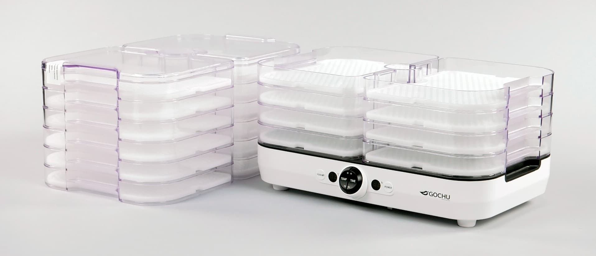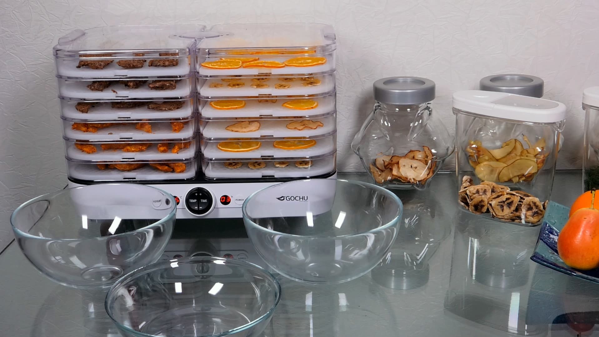 Дегидратор Gochu D-310 отличается компактными размерами, но вместе с тем достаточно хорошей вместимостью, точностью регулировки температуры до 1 °C, простотой управления и эксплуатации. Практические эксперименты подтвердили отличные результаты при одновременной сушке несовместимых продуктов без смешивания запахов и вкусов. Две камеры идеально подходят, на наш взгляд, для использования дегидратора в городских условиях, когда сушилка служит не столько для переработки урожая, сколько для приготовления десертов, закусок или полуфабрикатов. Например, за один цикл сушки можно совместно приготовить пастилу и мясную закуску к пиву. Конструкция лотков позволяет организовывать пространство сушильной камеру по желанию пользователя и обрабатывать сырье любой толщины, вплоть до сушки фруктов или рыбы целиком. Сквозь прозрачные стенки лотков удобно наблюдать за процессом сушки и решать, когда пришла пора менять поддоны местами.