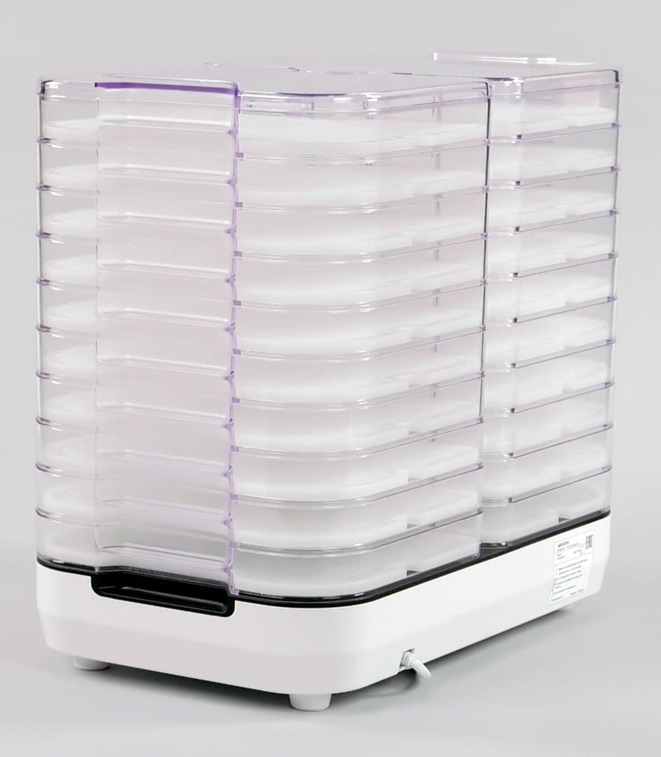 Лотки не имеют дна: в нижней части по всему периметру размещены выступы, на которые укладываются сетчатые поддоны. Обратим внимание, что благодаря такому устройству дегидратора, в лотках можно разложить продукты любого размера и высоты. Поддоны изготовлены из белого пластика, который не содержит бисфенол-А и легко очищаются.