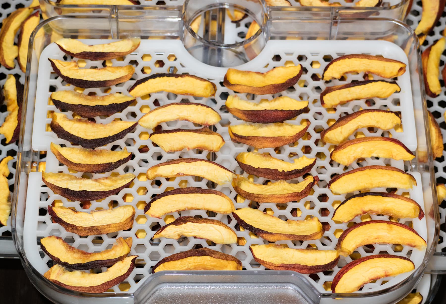 Вторыми к финишу подошли нектарины — за 16 часов. Ломтики фруктов также получились достаточно мягкие, гибкие на излом. Заметим, что лотки с нектаринами находились в верхней части дегидратора. На самых нижних уровнях стояли поддоны с виноградом, над ними — с бананами.