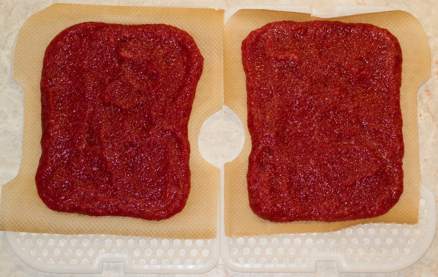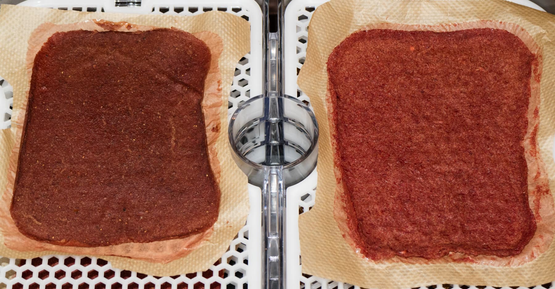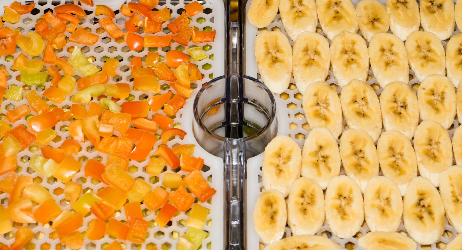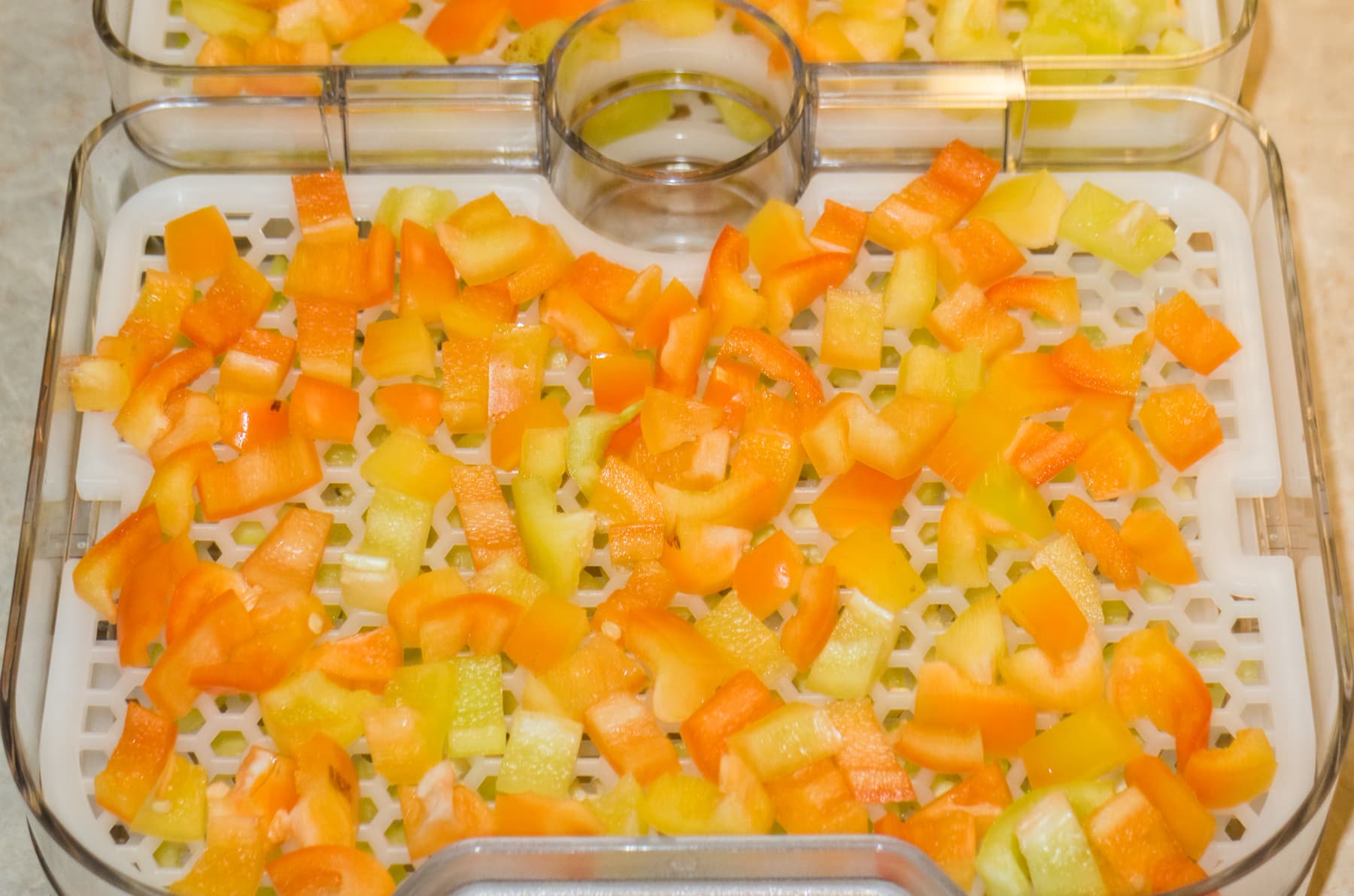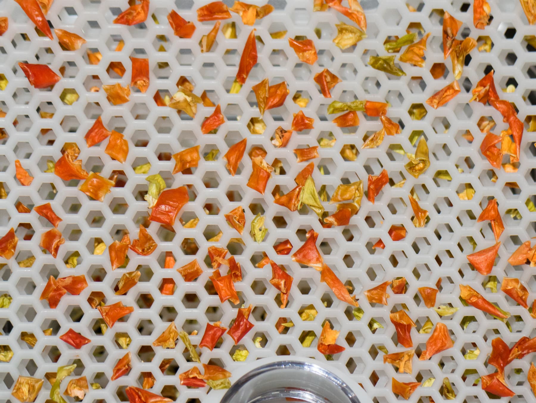 Продукты не перемешивали — сделать это и не просыпать, в частности, болгарский перец сквозь отверстия поддонов, представлялось невозможным. Потому мы просто усушили продукты до состояния ломкости и полной потери влаги.