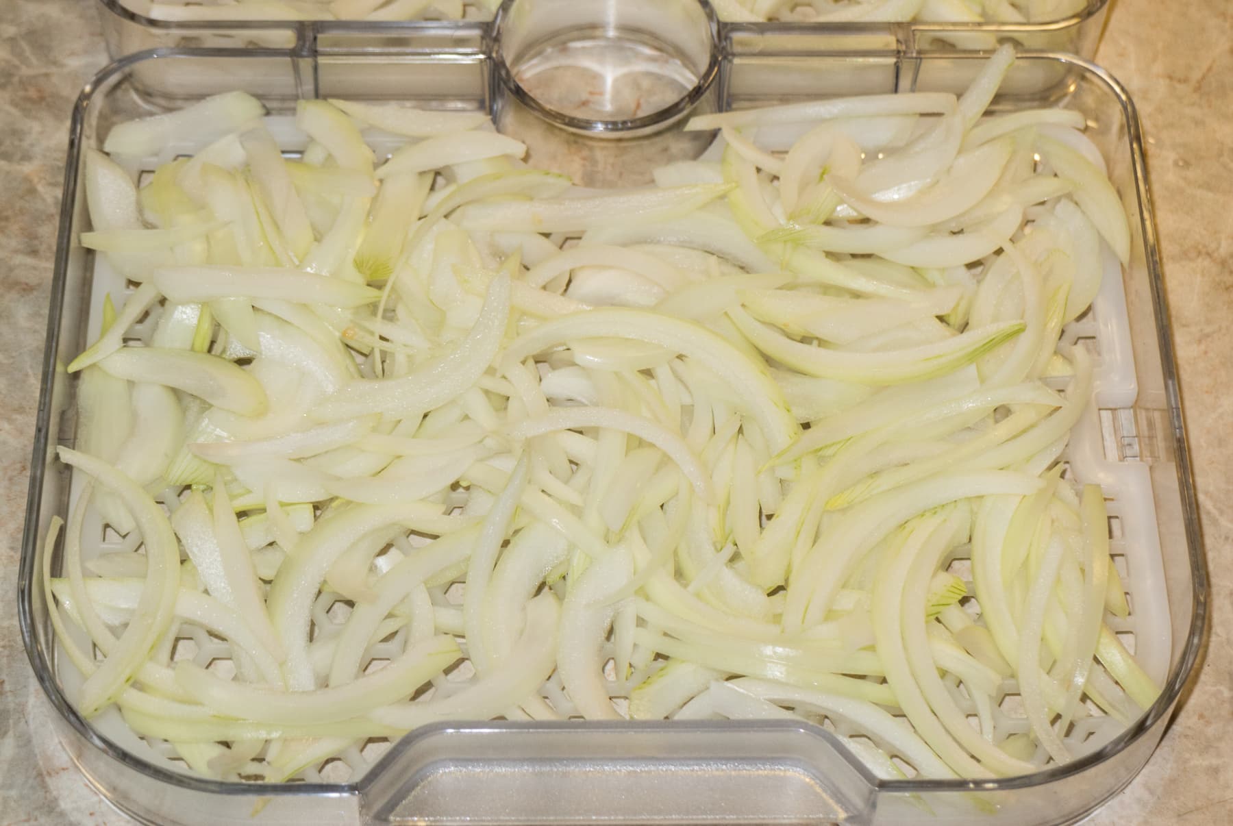 Для данного эксперимента мы взяли лук и болгарский перец. Почистили и нарезали на кусочки, которые, как нам казалось, должны удержаться на поддонах даже после уменьшения размеров. Поэтому лук нарезали полукольцами. На один поддон у нас поместился ровно один корнеплод. Не забывайте, что один поддон — это лишь половина лотка. На двух поддонах разместилось 390 г лука. Путем несложных арифметических вычислений можно выяснить, что полная загрузка дегидратора этим продуктом составит 3,9 кг лука.