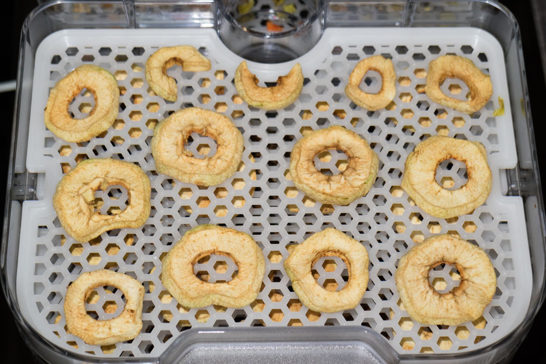 Первые 20 часов дегидрировали на 60 °C. Сначала нужной степени готовности достигли яблоки. Ломтики получились сухие, мягкие и гибкие. Обработку оставшихся фруктов и помещенных в соседнюю камеру куриных грудок продолжили на температуре в 67 °C.