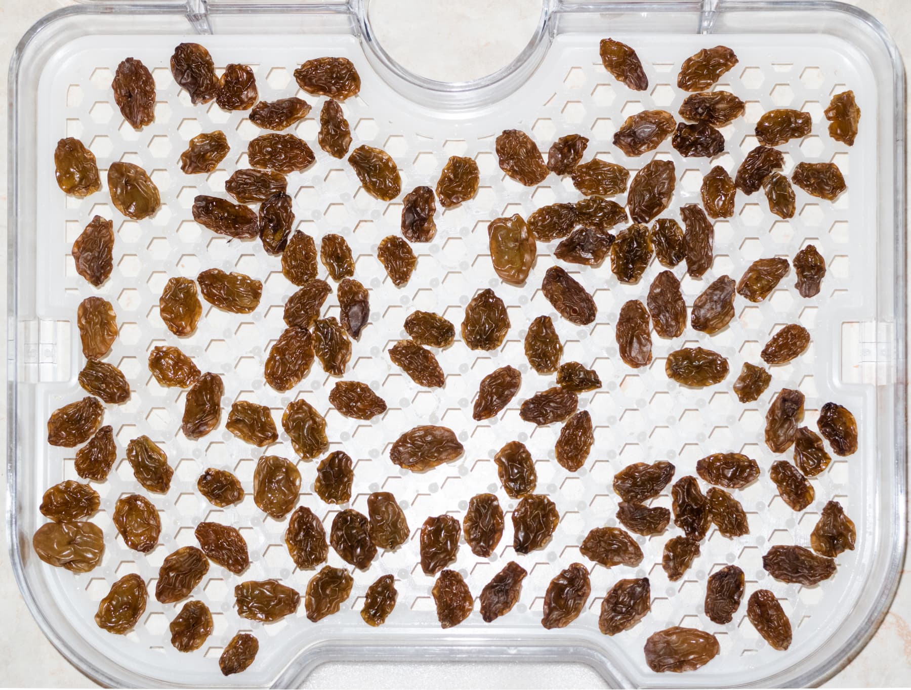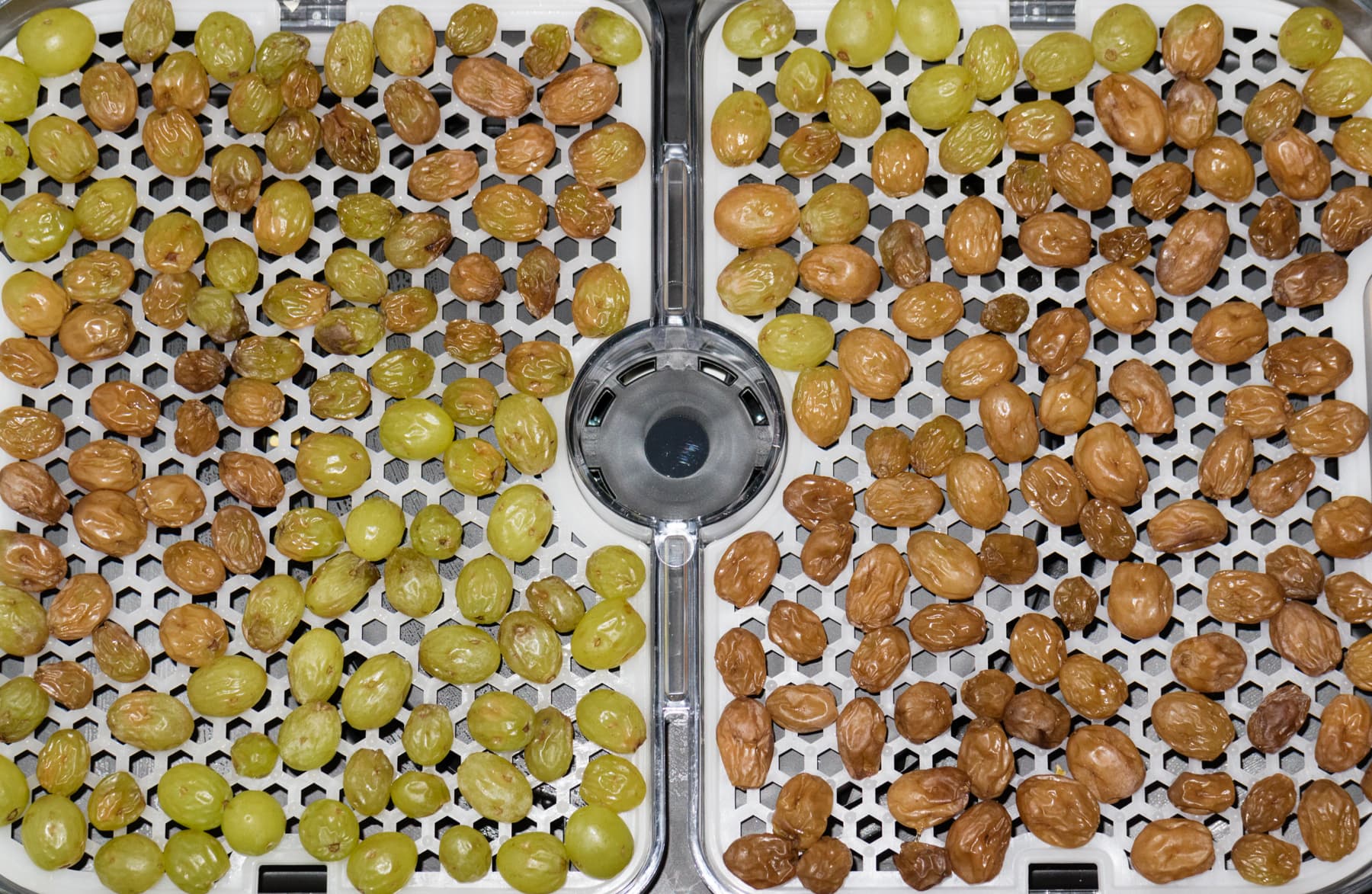 При всем этом сушка неравномерна. Вообще, разная степень просушки на разной высоте свойственна практически всем «вертикальным» (по компоновке) дегидраторам. В инструкции даже отдельно упомянуто, что для лучших результатов нужно менять поддоны местами в течение процесса. Однако в нашем случае неравномерность сушки иногда проявлялась в пределах одного поддона. Вот, например, виноград после 10 часов дегидрации. На фотографии видно, какая часть решетки просушилась хорошо, а на какую горячий воздух попадал хуже. Поэтому в идеале в ходе работы нужно не только менять поддоны местами, но и перемешивать продукты на поддоне.