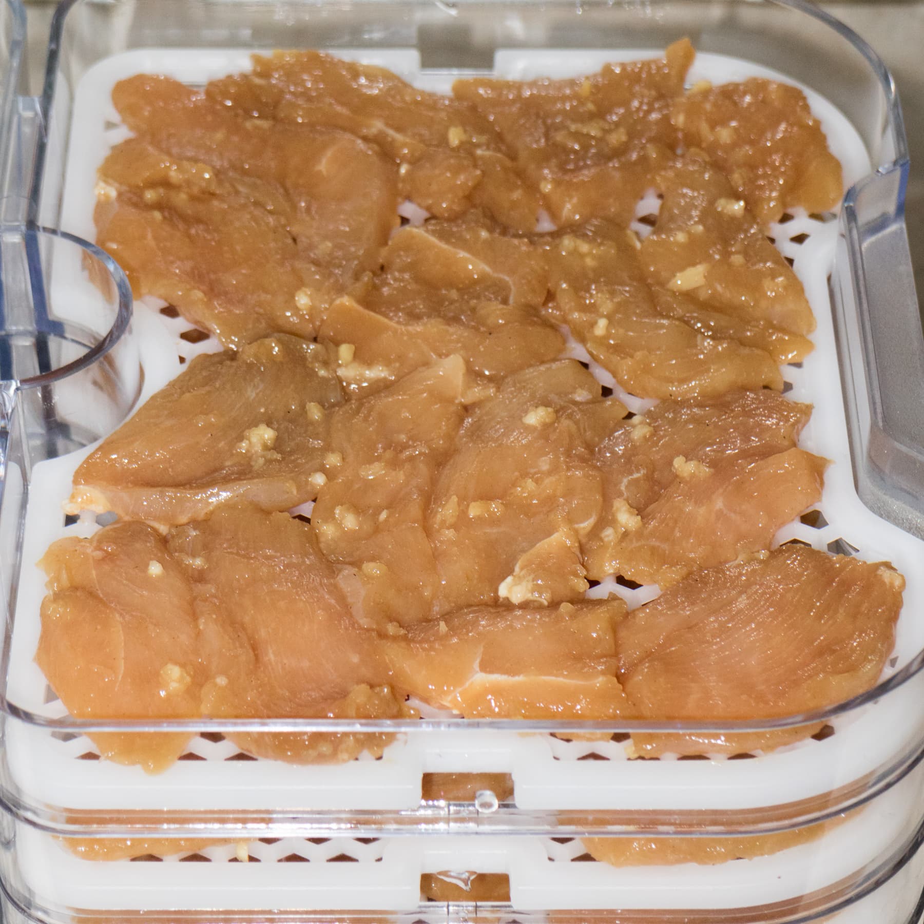 Куриная грудка была очищена от шкуры и отделена от костей. Замариновали в смеси соевого соуса, васаби, порошка имбиря и давленого чеснока. Грудки мариновались сутки, пока дегидратор был занят сушкой овощей. Затем разложили кусочки курицы на поддонах в один слой. Ровно один килограмм грудок поместился на пяти поддонах, т. е. двух с половиной лотках.