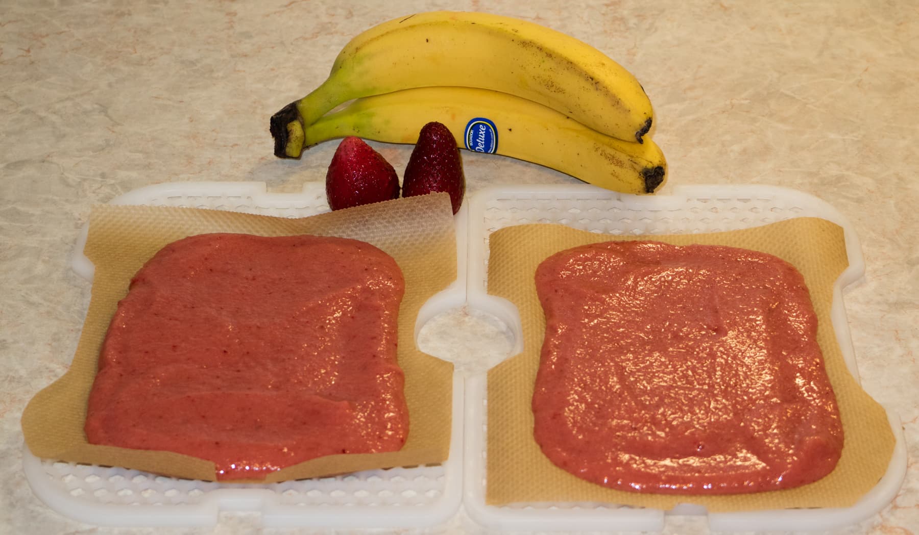 Мы приготовили два вида пастилы. Одна — с яблоками и вишней, вторая — из яблок, клубники и банана. Для этого мы измельчили очищенные яблоки и ягоды в блендере. В обе смеси добавили немного сахара. Затем выложили яблочно-ягодную массу на подложки, вырезанные из пергамента.