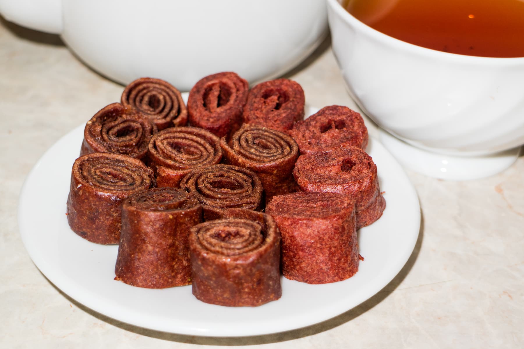 Процедура заняла около 13 часов. Лотки меняли местами пару раз. Находились поддоны с пастилой сразу над виноградом, в центральной части сушильной камеры. Несмотря на это, мы меняли местами более и менее высоко расположенные лотки. Когда пастила стала достаточно просушенной, она сохранила гибкость структуры, так что мы сняли ее с пергамента и скрутили в ролик. Затем нарезали на порционные кусочки.