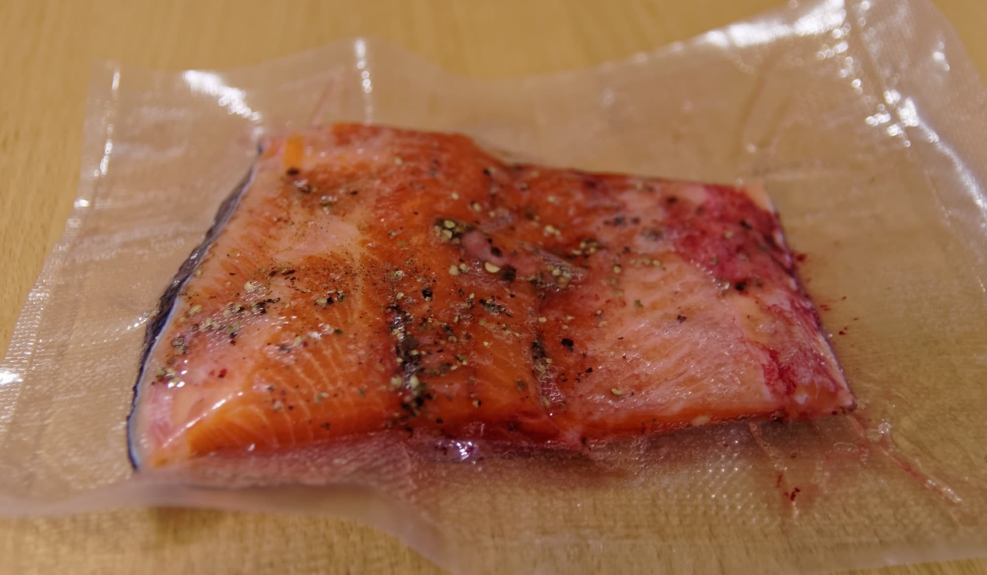 Фрагмент той же рыбины филировали, с обеих сторон посыпали солью, сахаром и дробленым молотым перцем в соотношении 2:1:1. На кусок рыбы весом около 600 г понадобились столовая ложка соли без верха. После вакуумирования рыбу положили в холодильник.