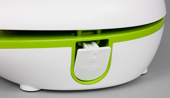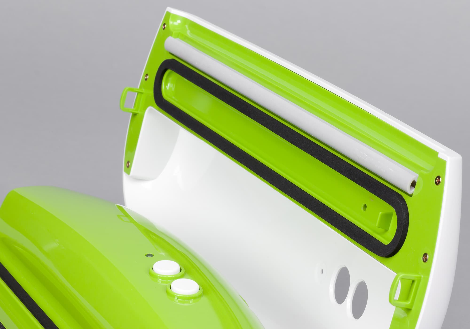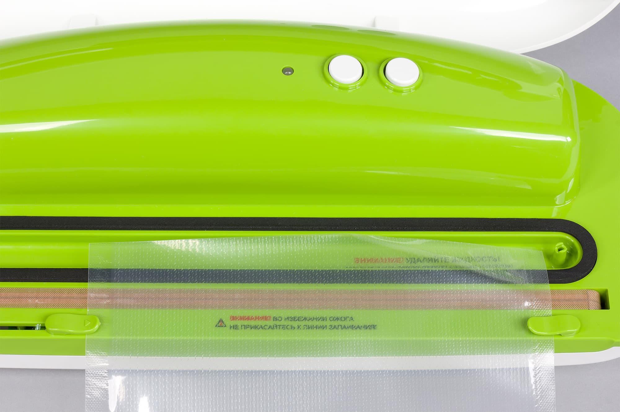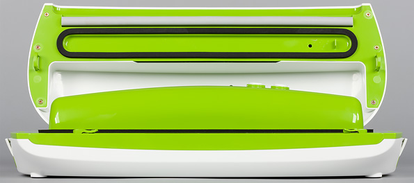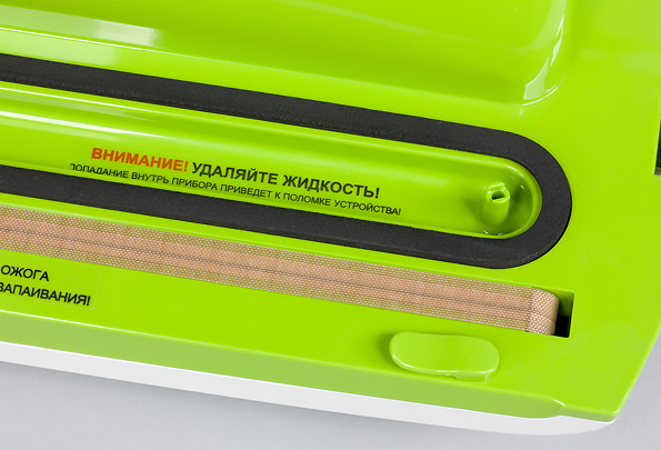 На ощупь аппарат приятный, что характерно для ABS-пластика, при перемещении не норовит выскользнуть из рук. Зеленая поверхность внутренней части создает радостное настроение — яркий и греющий цвет. Исполнение аккуратное: удобно и легко и нажимать кнопки, и фиксировать пакет передними клипсами, и защелкивать корпус аппарата — боковыми.