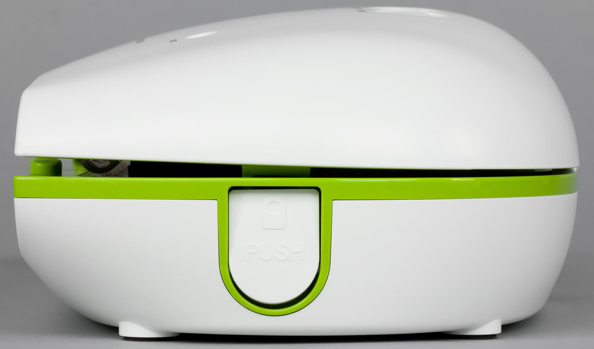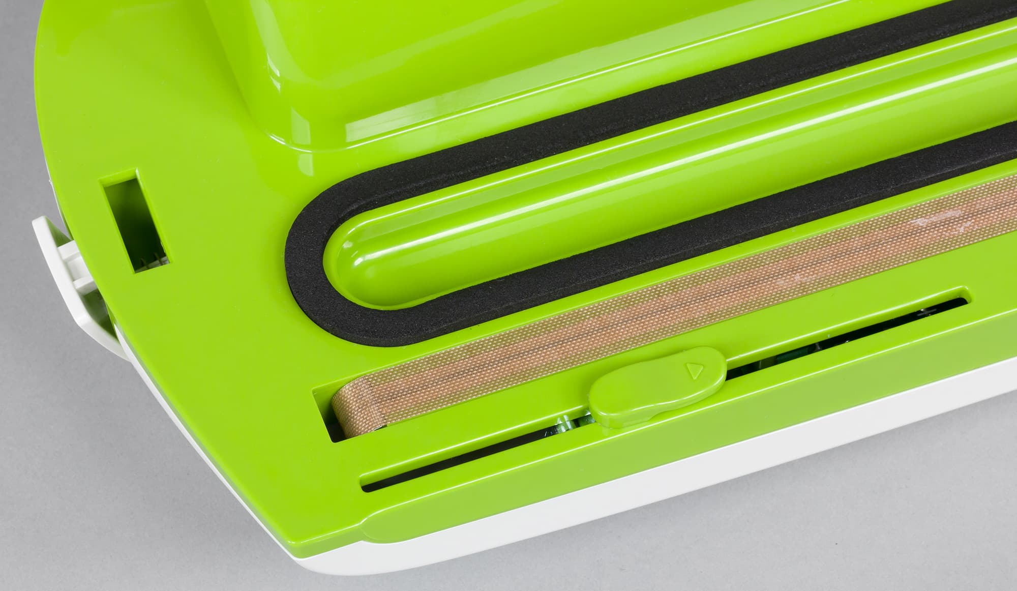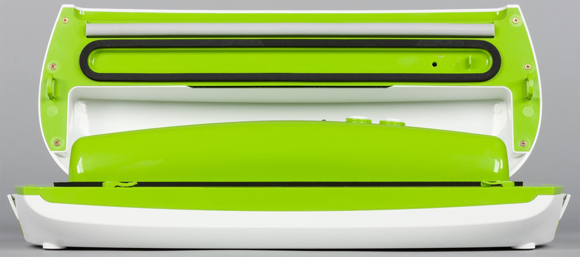 Визуально вакууматор выглядит достаточно необычно из-за заметно скругленных углов и ярко-зеленой вставки на белом пластике корпуса.