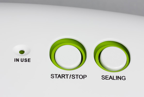Управление вакууматором осуществляется с помощью двух кнопок: старт/стоп и запаивание. Первая запускает автоматическую работу прибора, который самостоятельно проделывает полный цикл: откачивает воздух из пакета с продуктом и запаивает его. Вторая служит для принудительной остановки и запайки пакета раньше, чем это происходит в автоматическом режиме, что актуально для влажных или «нежных» продуктов, которые могут деформироваться при сжатии пакета — например, выпечки или сочных фруктов.