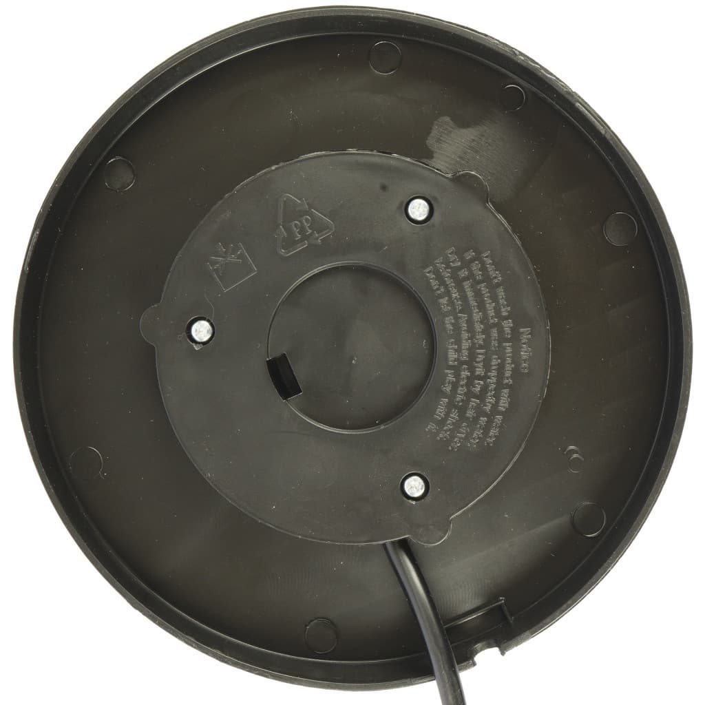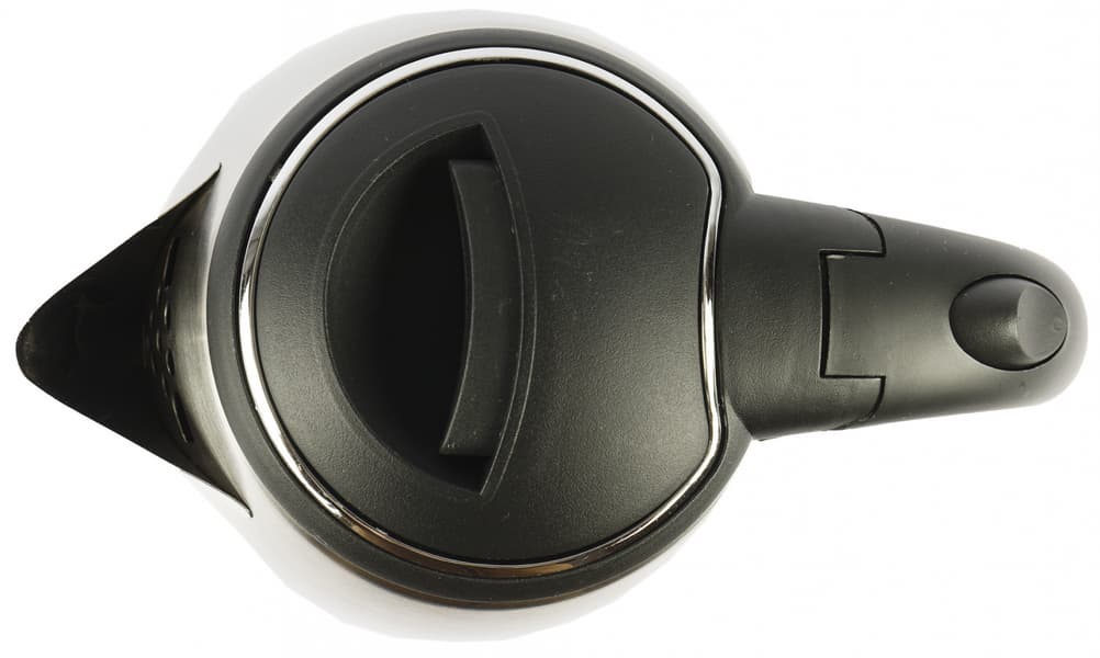 Для открытия пластиковой крышки предусмотрена защелка. Под ней круглое отверстие для добавления воды, не очень большое, но комфортное. Из-за формы чайника корпус заужен к верхней части, никаких проблем с набиранием воды это не вызывает, а для мытья чайника средняя взрослая рука спокойно проходит внутрь. На основании корпуса есть фабричная наклейка с номером модели и некоторыми техническими параметрами.