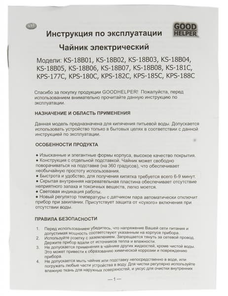 Очень тонкая, лаконичная брошюра из несколько страниц на тонкой бумаге без обложки. Показательно, что она подходит не только KS-18B02, но и еще десятку перечисленных в начале инструкции моделей. Покупателя в ней благодарят за покупку, подчеркивают, что модель предназначена «для кипячения питьевой воды», перечисляют правила безопасности, меры предосторожности, советы по чистке и уходу. Здесь же гарантийный талон, условия гарантии и список авторизованных сервисных центров.