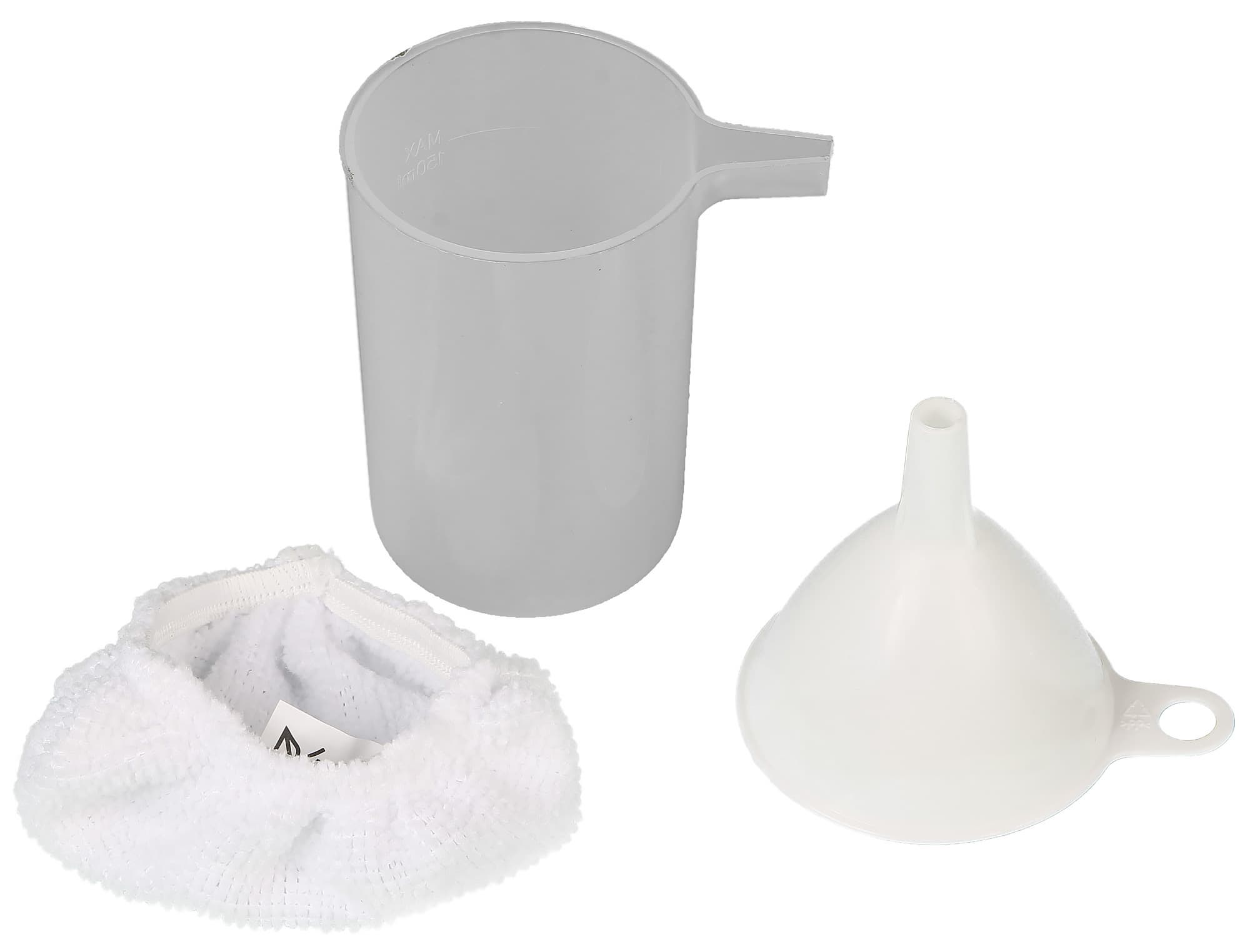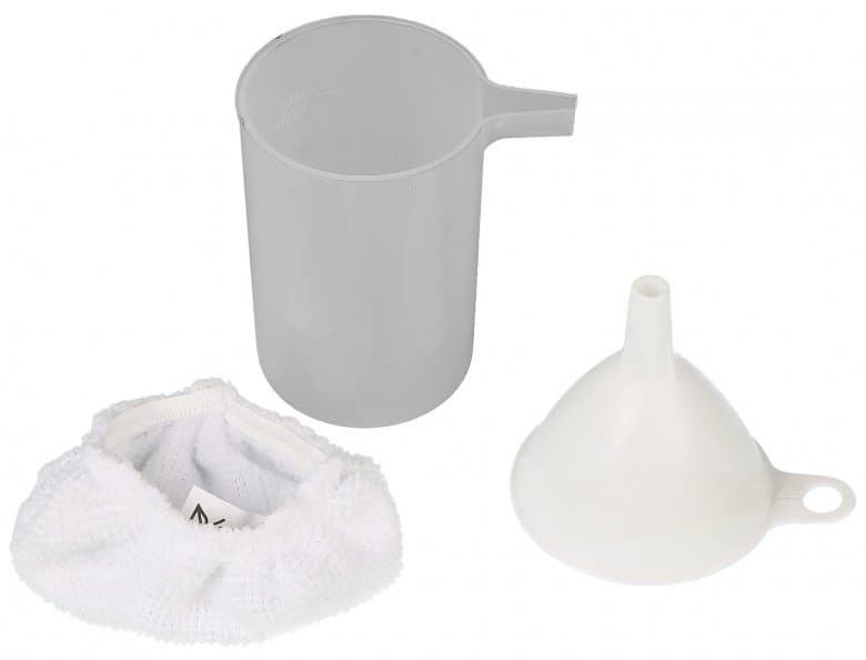 Заливка воды осуществляется с помощью входящих в комплект аксессуаров: небольшой воронки и пластикового мерного стакана. Мерная емкость имеет специальный носик, облегчающий слив жидкости.