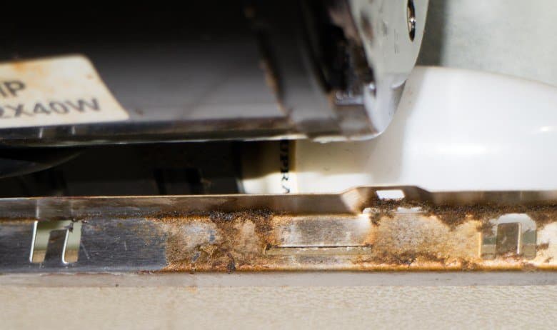 С внутренней стороны вытяжки скопился застарелый напек из жира и пыли. С левой стороны на снимке продемонстрирован очищенный участок: видно, что в углу и по краям грязь полностью не удалена, несмотря на все наши усилия. Но и задача перед прибором стояла крайне нетривиальная.