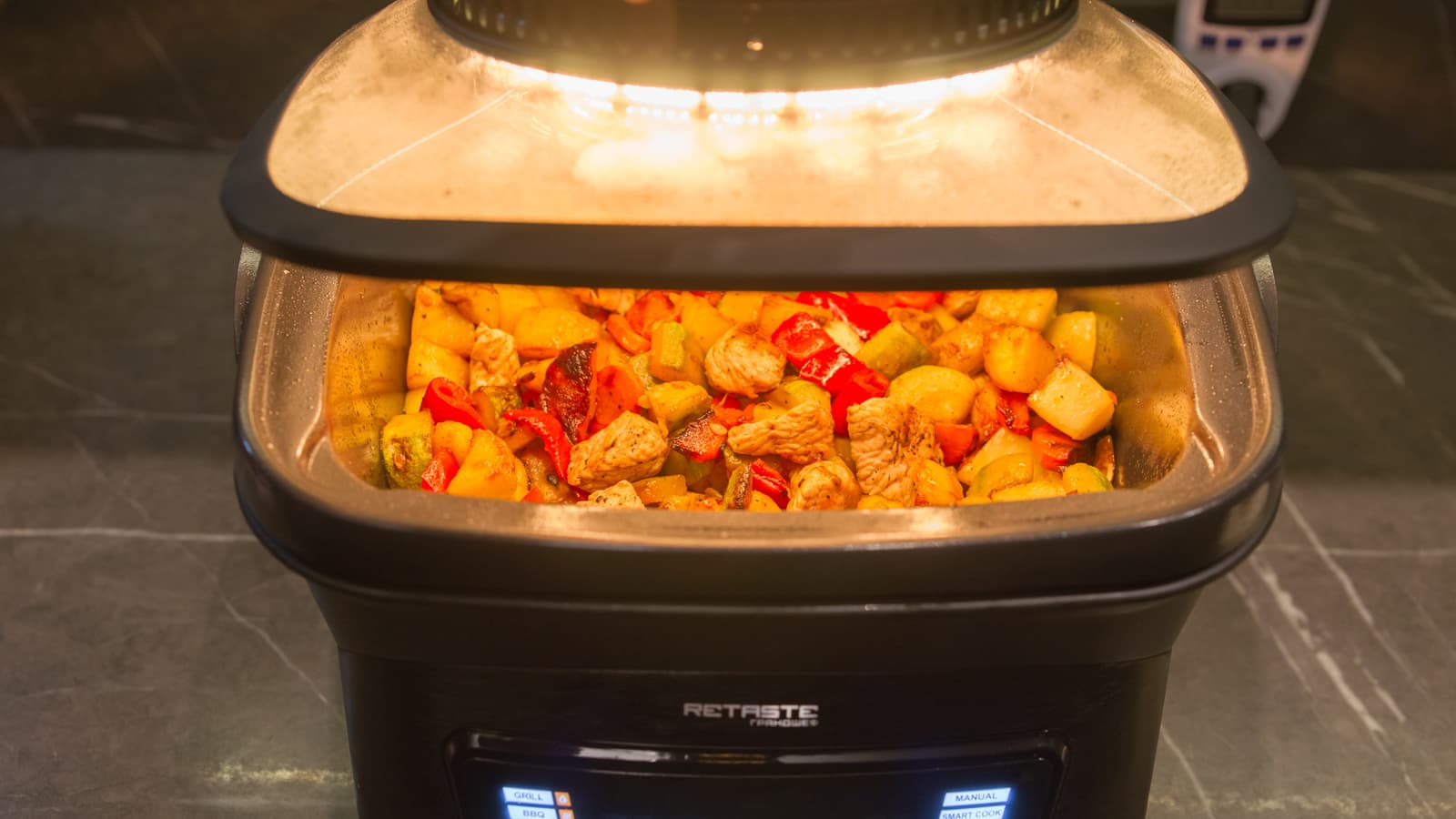 Аэрогриль ГрандШеф Retaste GRND-001 пробыл с нами несколько недель и действительно смог заменить собой большую часть кухонной техники, которая обычно используется при приготовлении еды на каждый день. Устройство имеет широкий выбор режимов и достаточный диапазон установки параметров для любых сценариев: от медленного томления на низкой температуре до быстрой обжарки и качественного запекания с максимальным нагревом.
