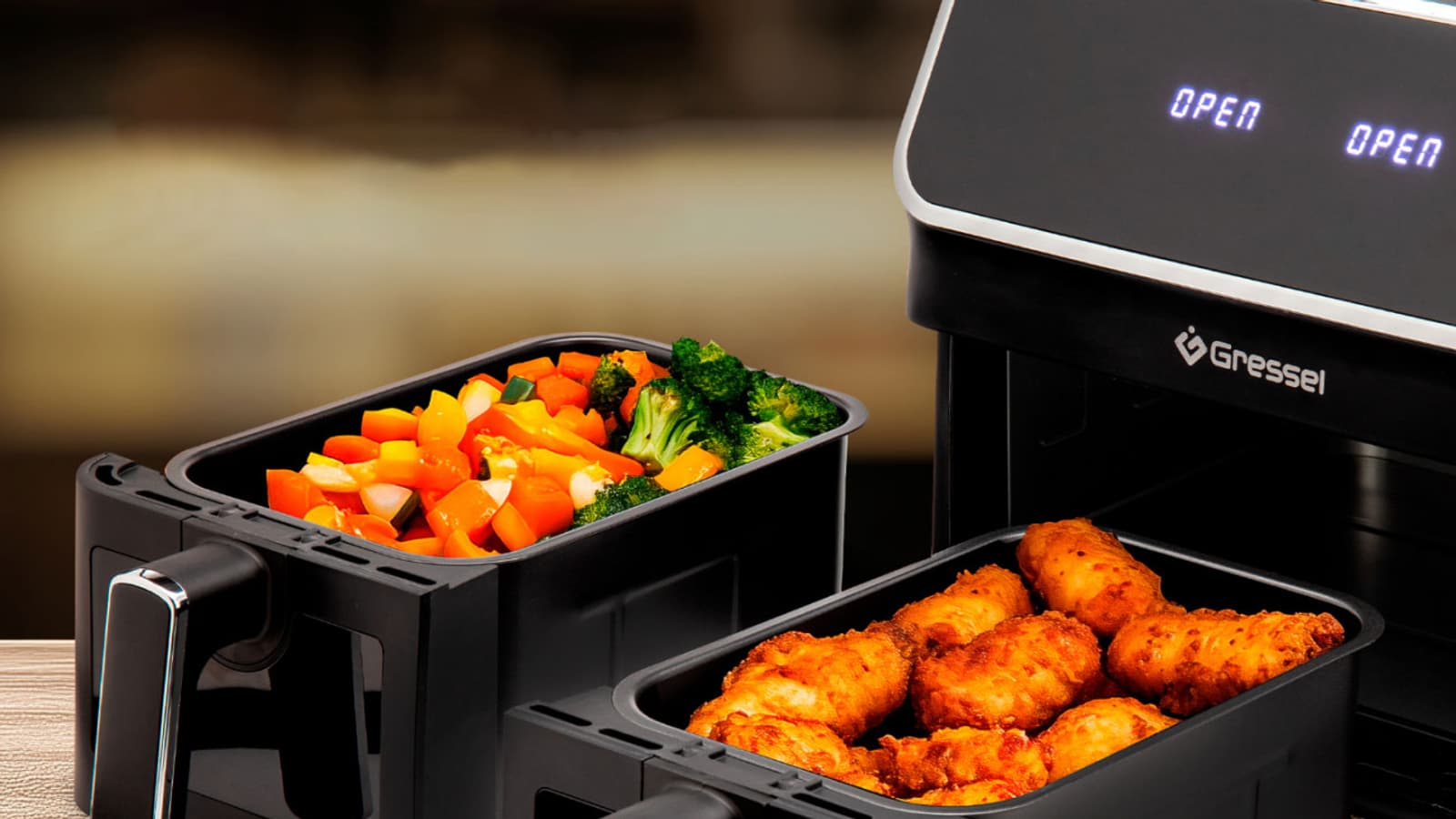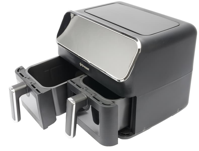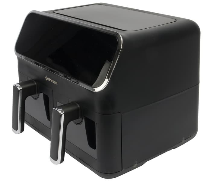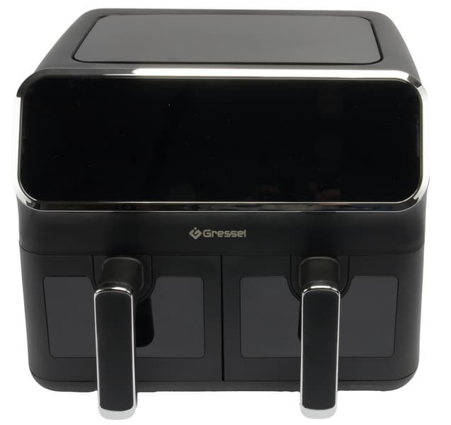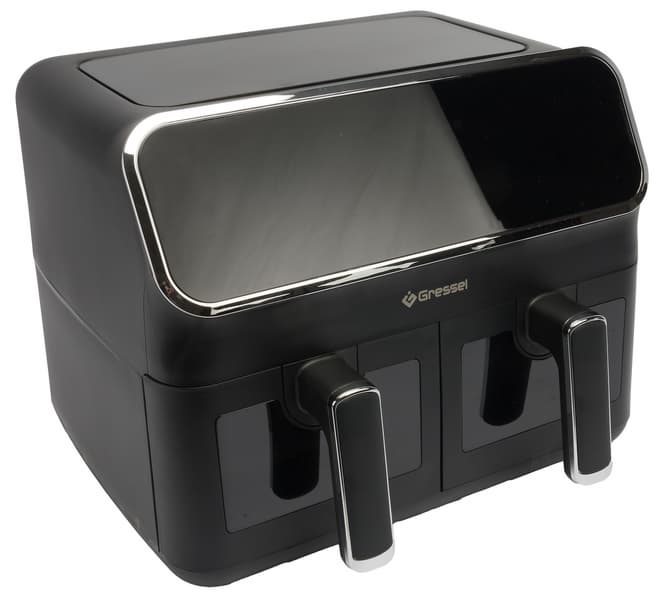 Аэрогриль Gressel GAF-1825 — это мощный (2700 Вт) прибор с двумя чашами по 4 литра, сенсорным управлением и девятью программами. Температура всех программ регулируется в диапазоне от 80 до 200 °C, а время готовки может быть задано до 60 минут. Формат с двумя раздельными чашами позволяет как готовить разные блюда, например мясо и гарнир, одновременно, так и использовать лишь одну чашу для небольших порций (либо готовить двойную порцию, используя оба отсека для одних и тех же ингредиентов).