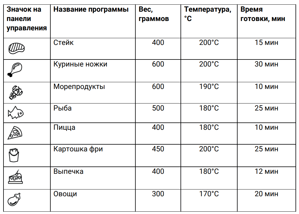 Во всех программах можно настроить время 1—60 минут и температуру 80—200 °C по своему усмотрению. Всего программ 8, и вот такие настройки они имеют по умолчанию: