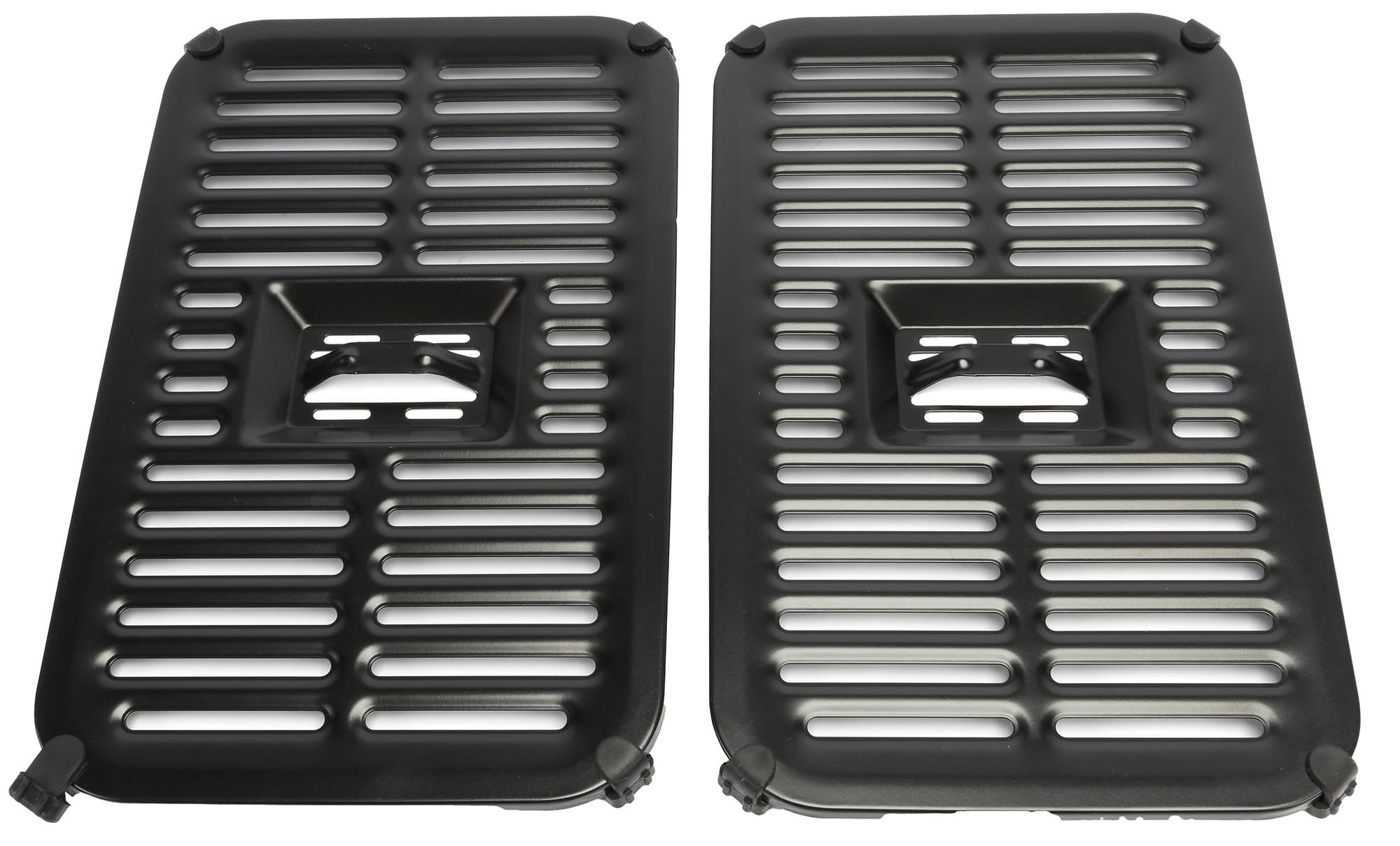 У каждой решетки в центре есть небольшие ручки, за которые их удобно вынимать из чаш. А по углам закреплены силиконовые прокладки, которые помогают пластинам надежно держаться внутри даже при наклоне лотков, но при этом не царапать их антипригарную поверхность.