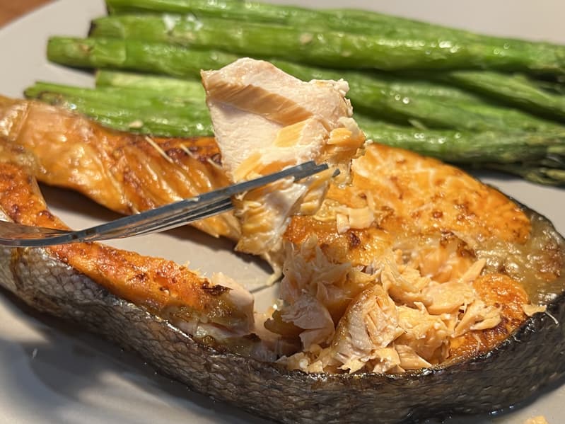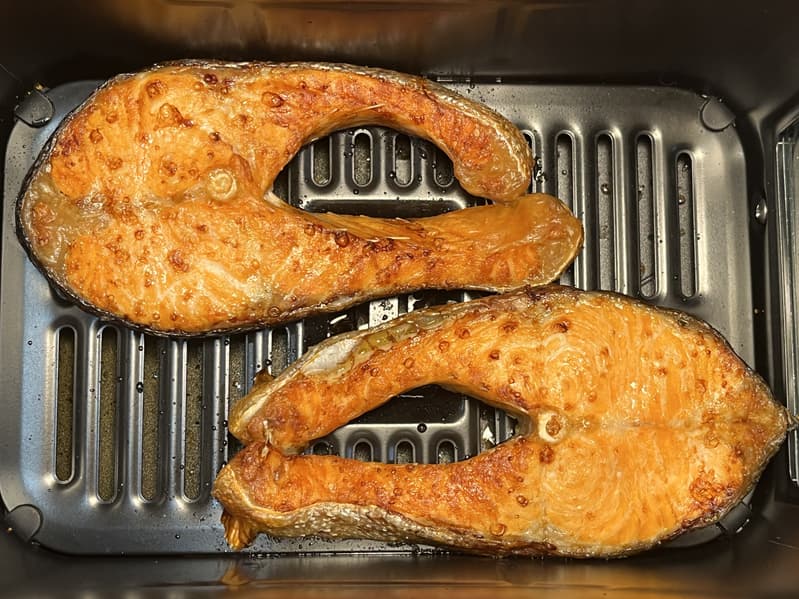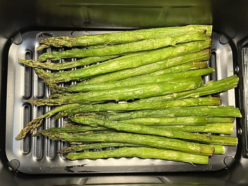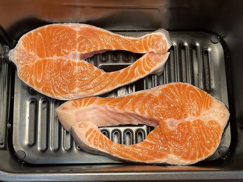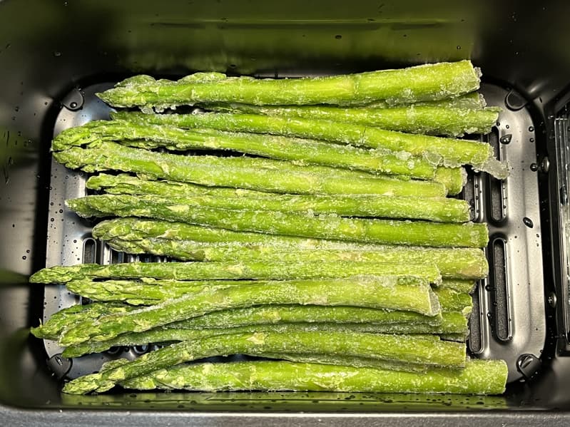 Для данного теста мы выбрали два сочных и свежих стейка форели для одной чаши и замороженную спаржу для второй. Каждый кусок рыбы мы натерли смесью лимонного сока, соли и белого молотого перца, а спаржу слегка смазали растительным маслом.