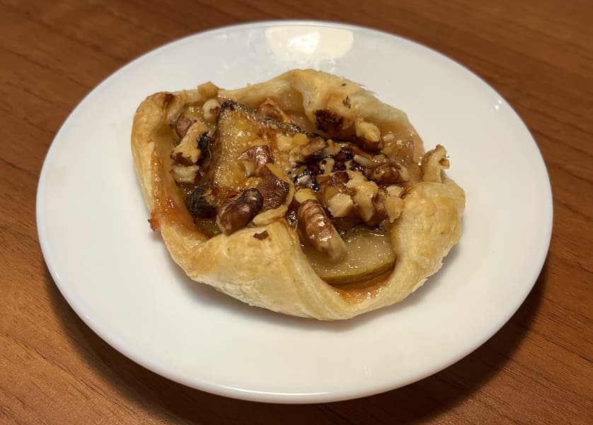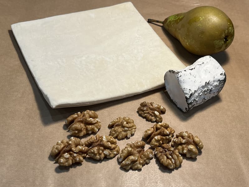 Нашим третьим тестом стали быстрые слойки с грушей, козьим сыром с белой плесенью и грецким орехом. Такой десерт сочетает в себе много разных вкусовых оттенков и отлично подходит к чаю, кофе и белому вину.