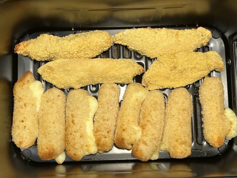 В данном тесте мы готовили закуски параллельно: картофель-фри — в левом лотке, куриные стрипсы и сырные палочки — в правом.