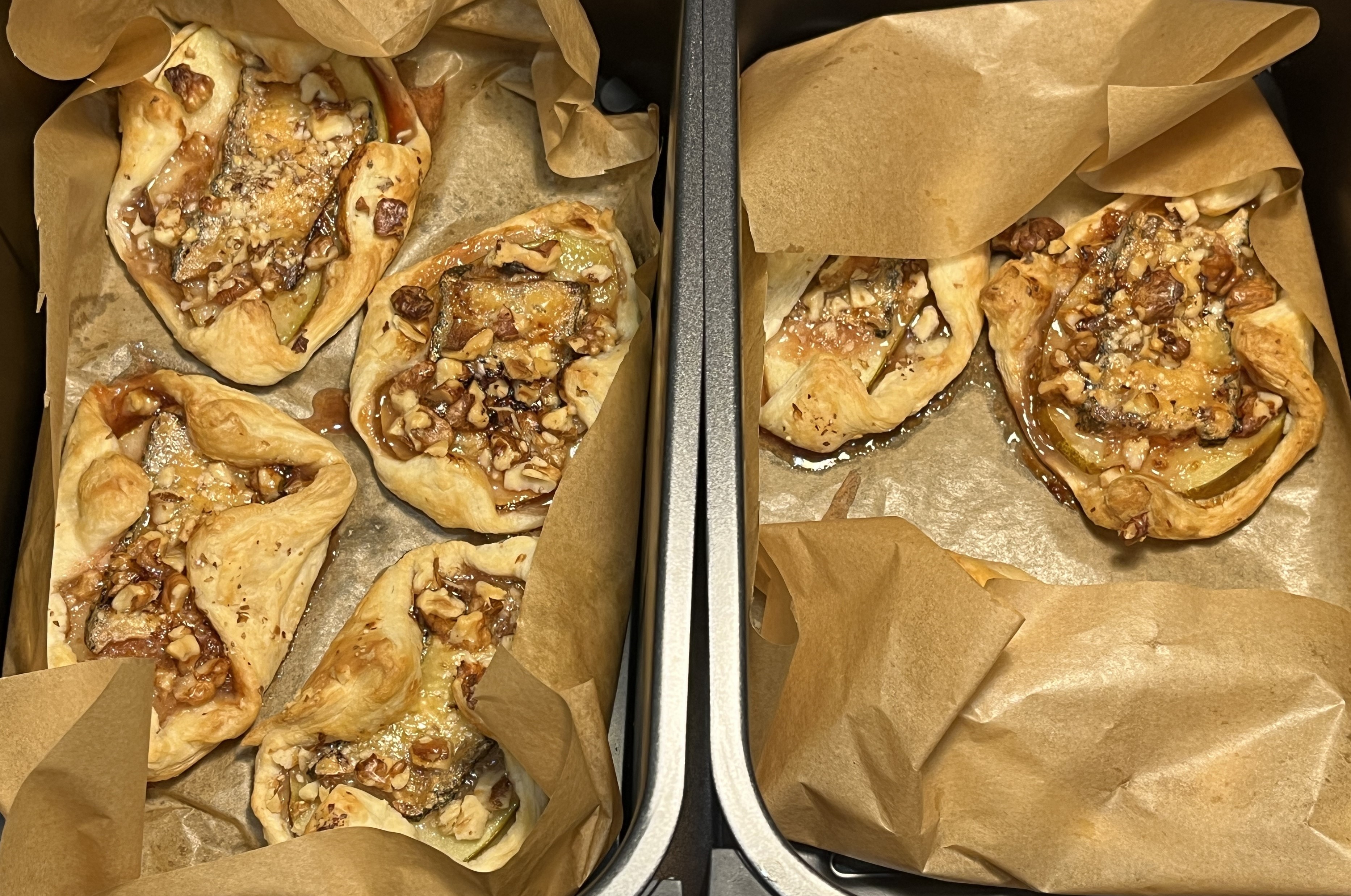 Раскатали тесто и небрежно завернули в него по одному ломтику груши и сыра, а сверху посыпали кусочками орехов. После чего разложили заготовки на пергамент внутри чаш и отправили их выпекаться на режиме «Пицца» в течение 10 минут.