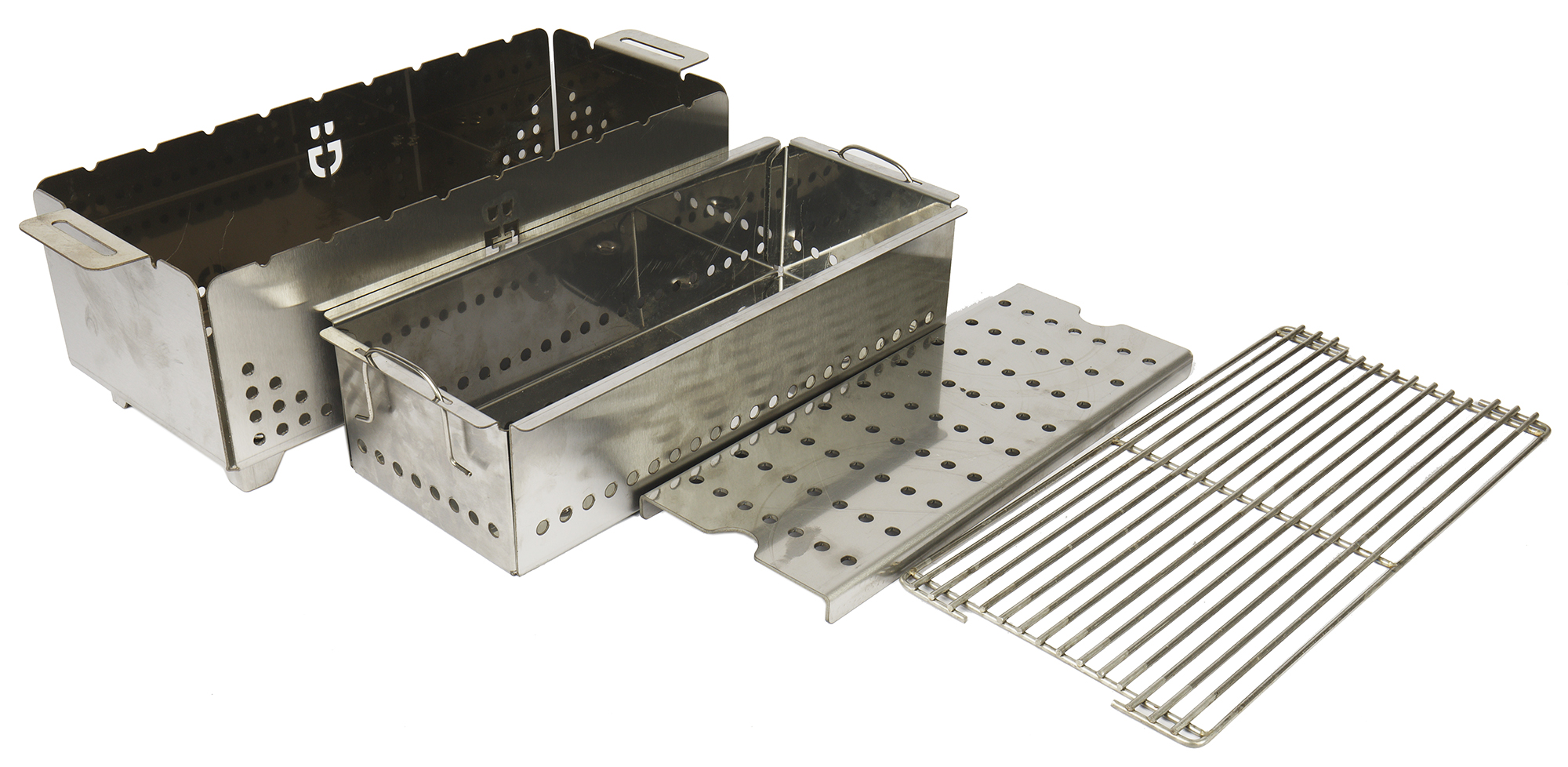 Гриль представляет собой компактную «коробочку» из нержавеющей стали, аккуратно собранную и довольно увесистую по причине использования нержавейки солидной толщины: внешняя и внутренняя коробки сделаны из стали толщиной 1,5 мм, поддон-колосник имеет толщину 2 мм, прутья решетки — 4 мм.